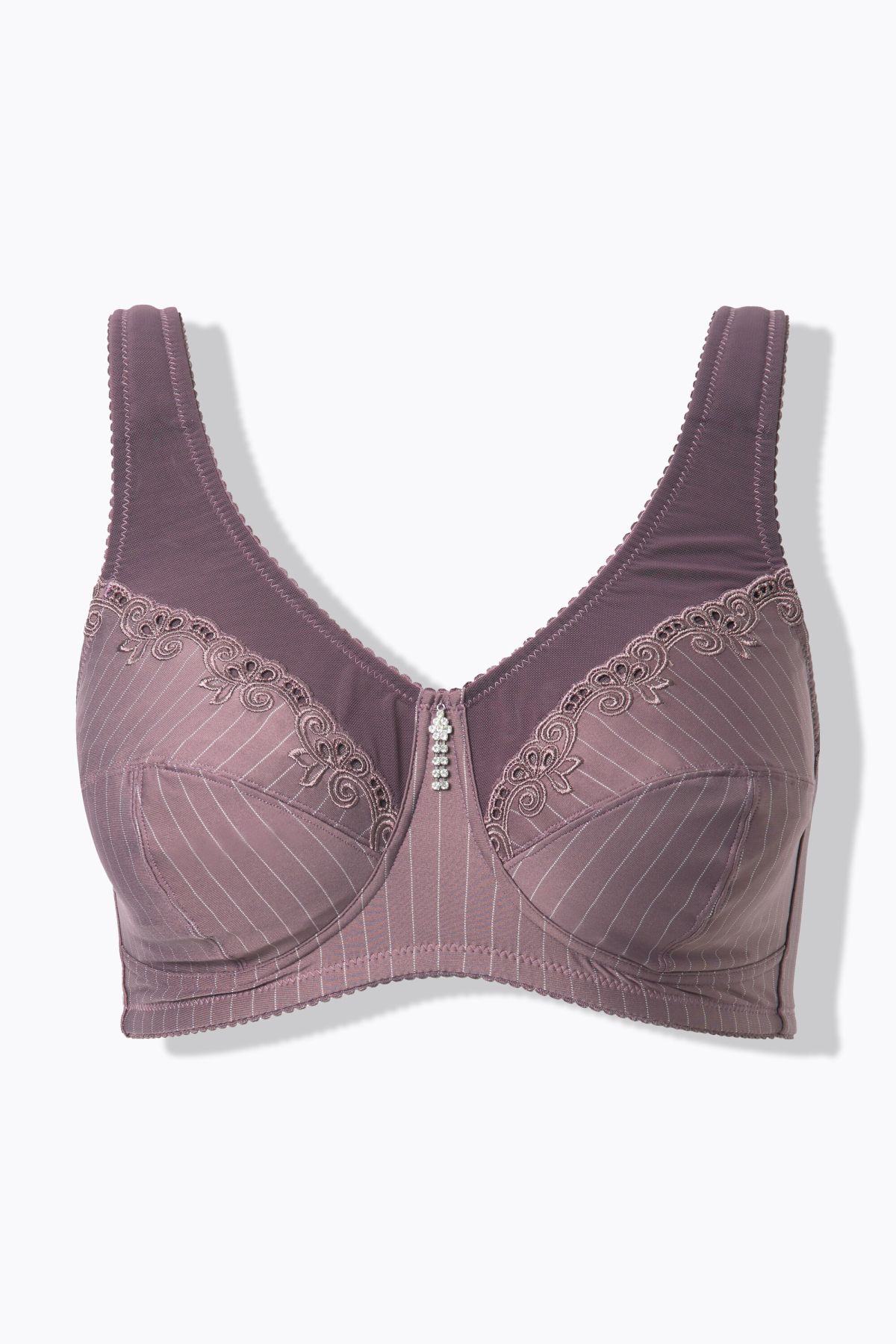 Pinstripe Support Bra - our super supportive Kelly style. Solid at the top, pinstripe below with a center rhinestone accent. Adjustable straps and hook and eye closures. The classical pinstripe design gives this wireless bra a timeless elegance and design.