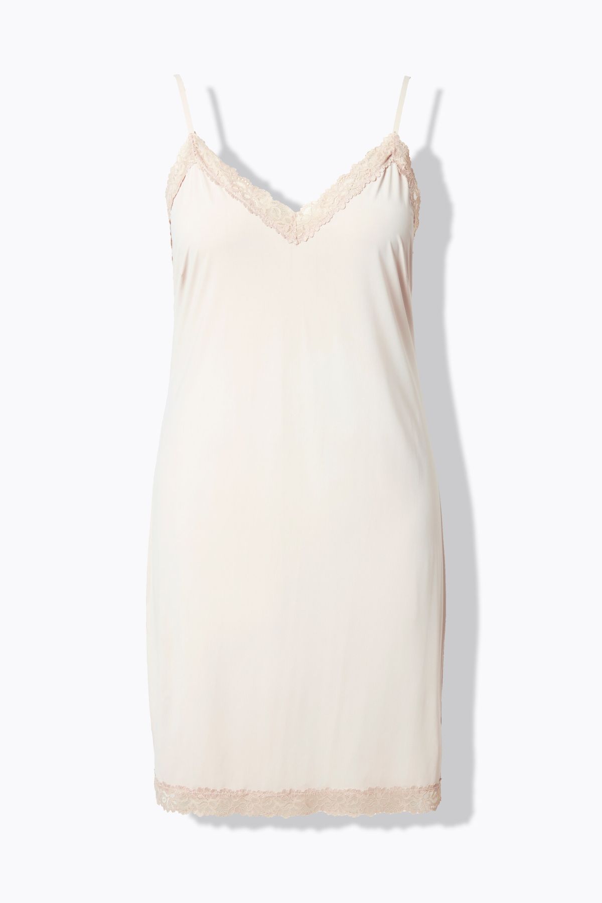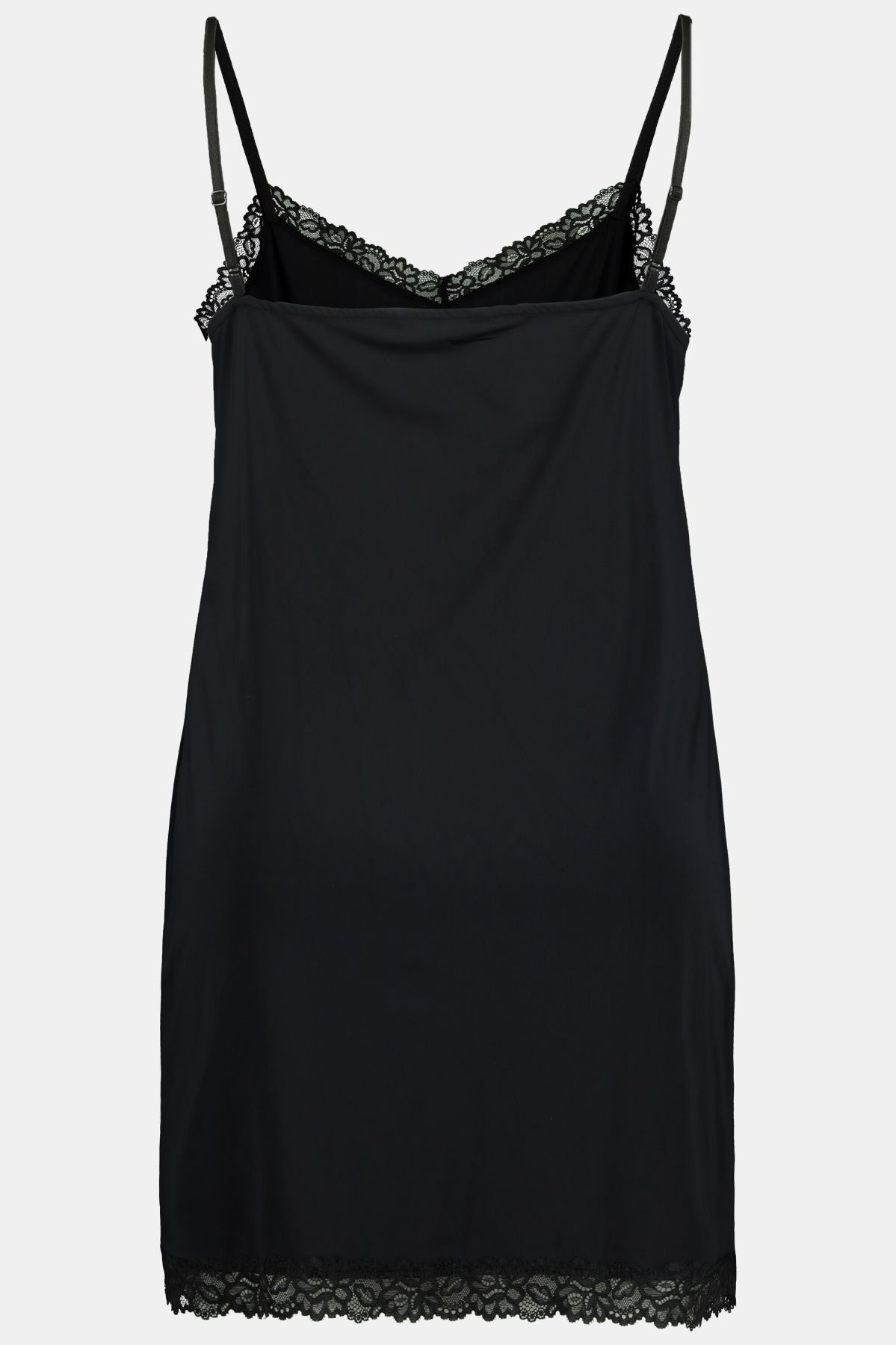 Lace Trim Spaghetti Strap Stretch Knit Slip - opaque jersey knit style to wear under you outfits for a smooth line. Lace trim V-neck, adjustable spaghetti straps, and lace trim hem. A-line fit.