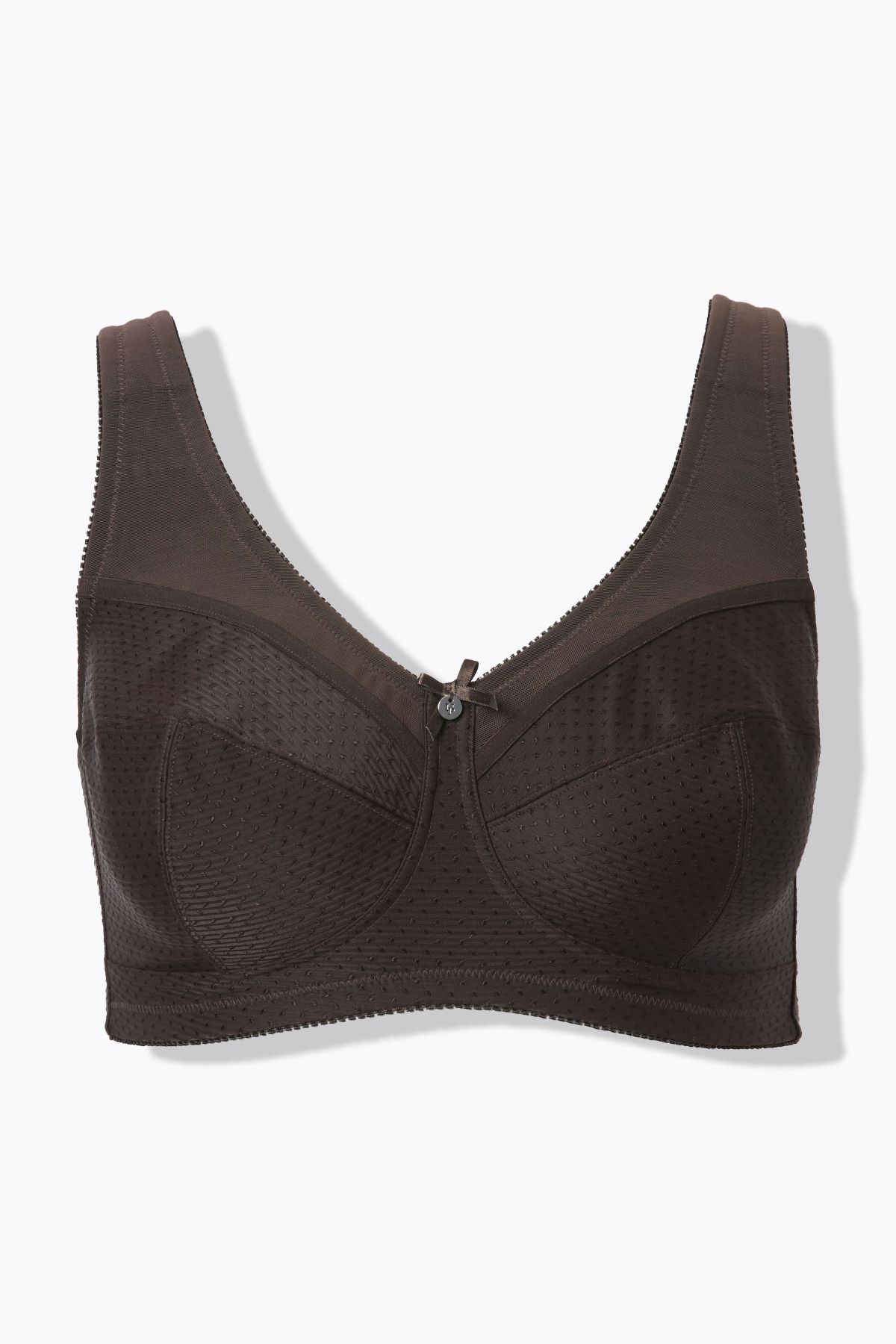 Jacquard Dot Wirefree Support Bra - our super supportive wirefree Kelly style. Pretty jacquard dot cups, solid accents, and center satin bow accent. Wide comfortable adjustable straps and back hook-and-eye closures.