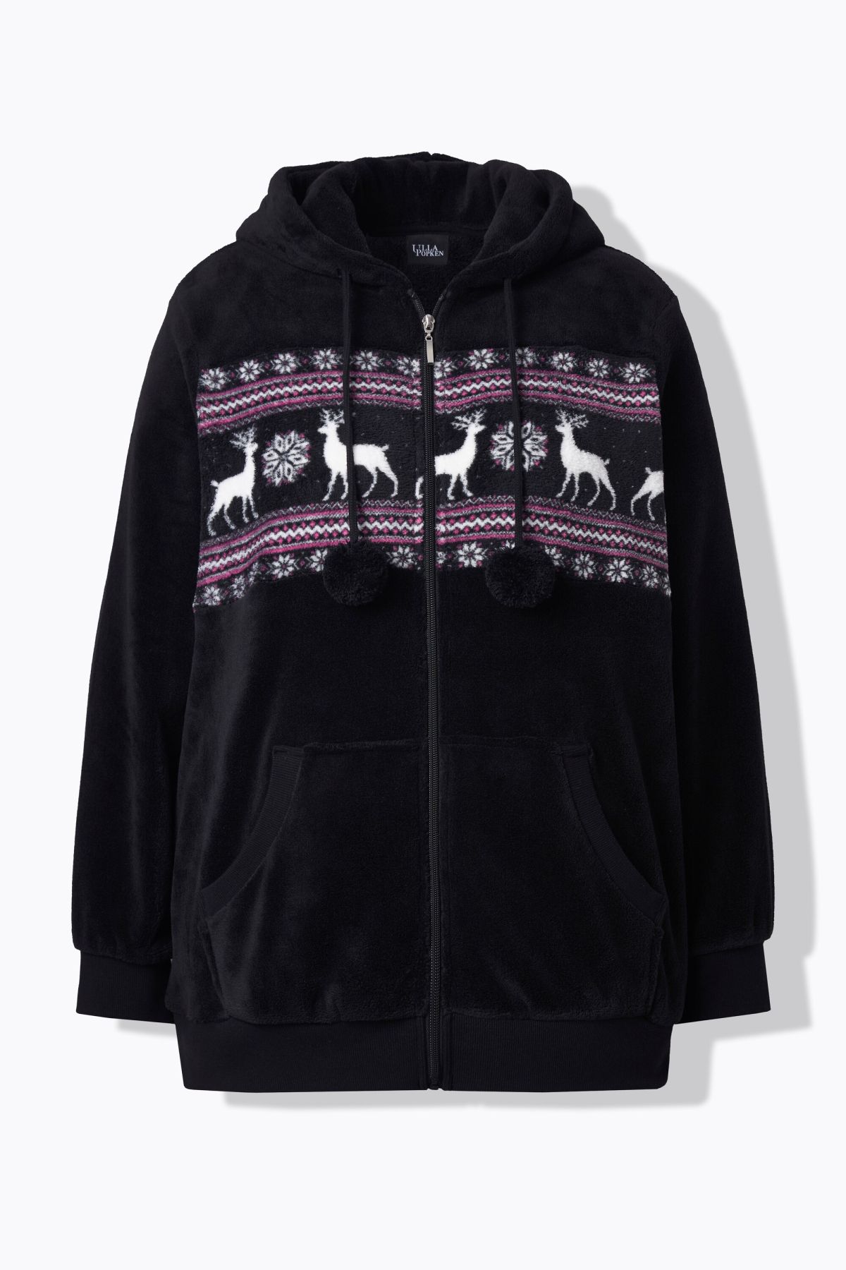 Norwegian Print Plush Lounge Jacket - so comfy you'll never want to take it off. Adjustable drawstring pom pom tie attached hood, front zipper, front Norwegian print, contrast trim kangaroo pockets, and contrasting ribbed cuffs on the long sleeves and bottom hem.