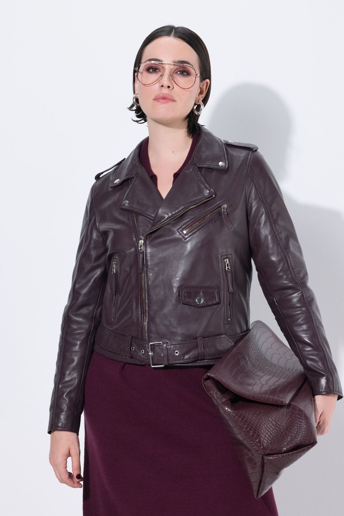 Biker Style Leather Jacket - this edgy jacket features studded lapels and an asymmetric zipper. Long sleeves, two zippered pockets, belt at hem.