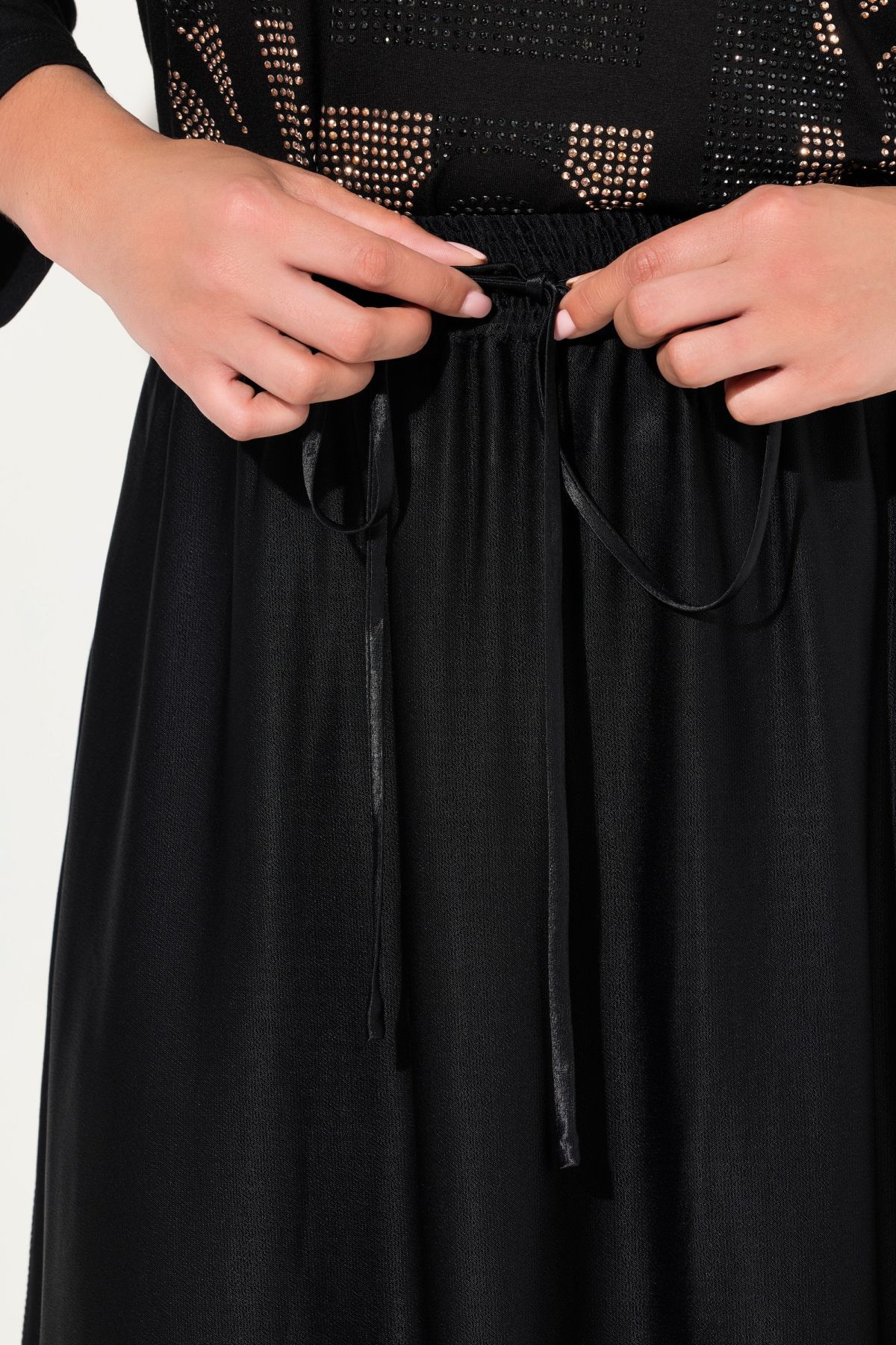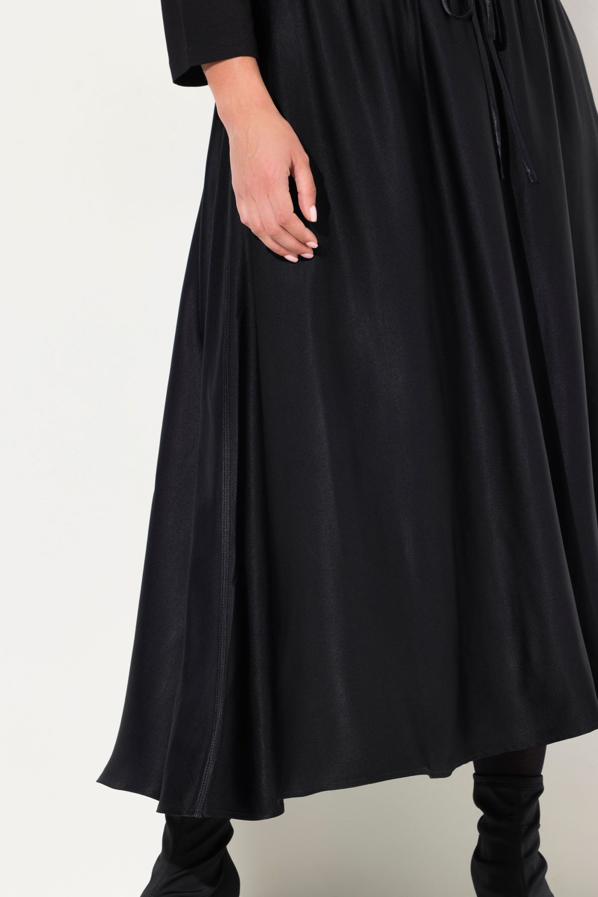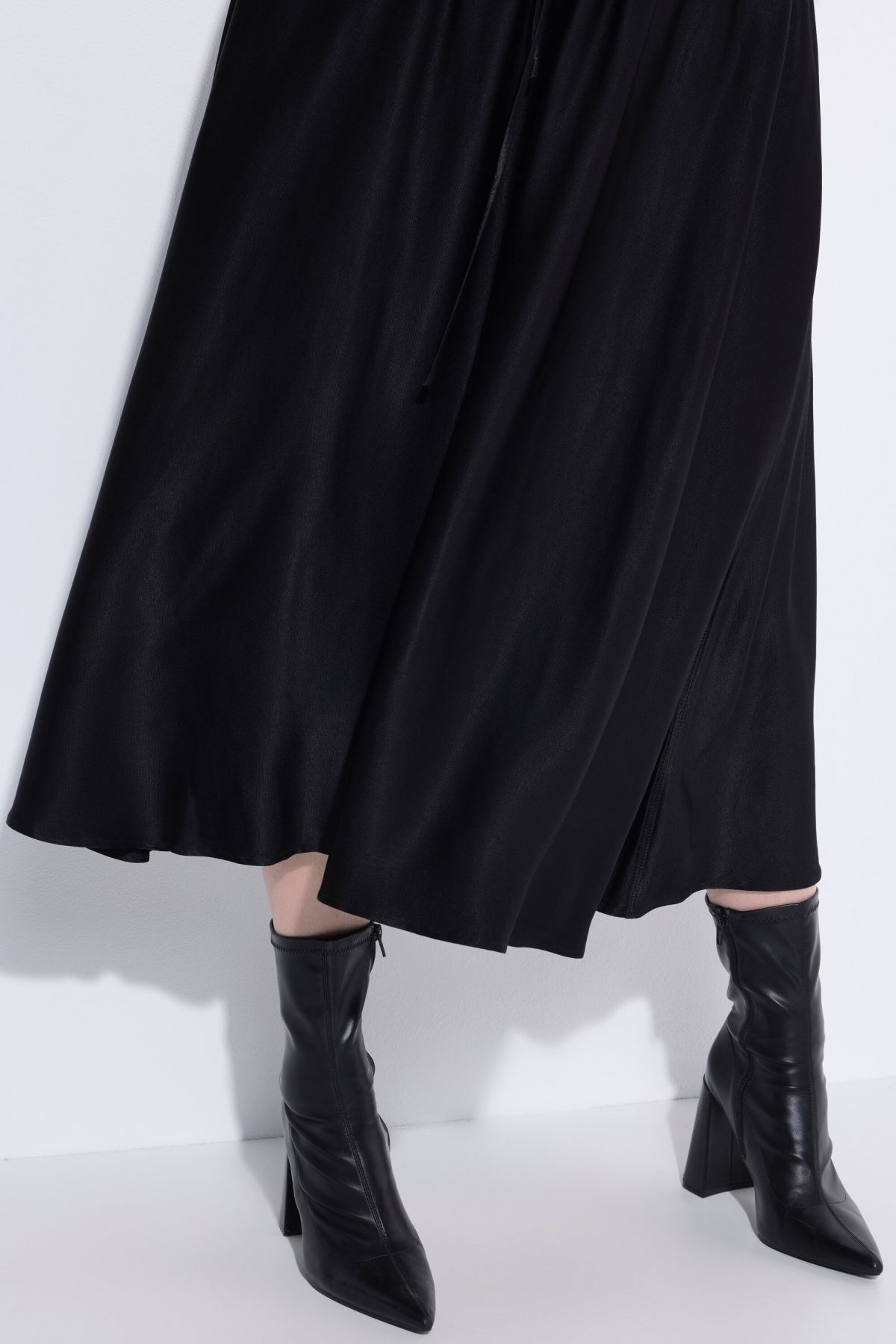 Елегантен блестящ сатен, А-силует с изпъкнал подгъв, удобен ластичен колан с връзка, миди дължина, дължина около 83 см.