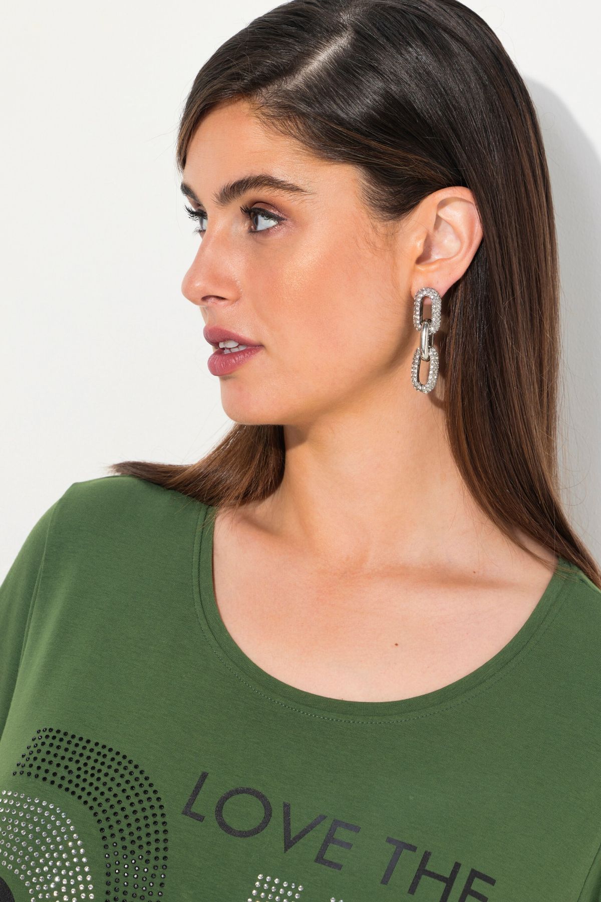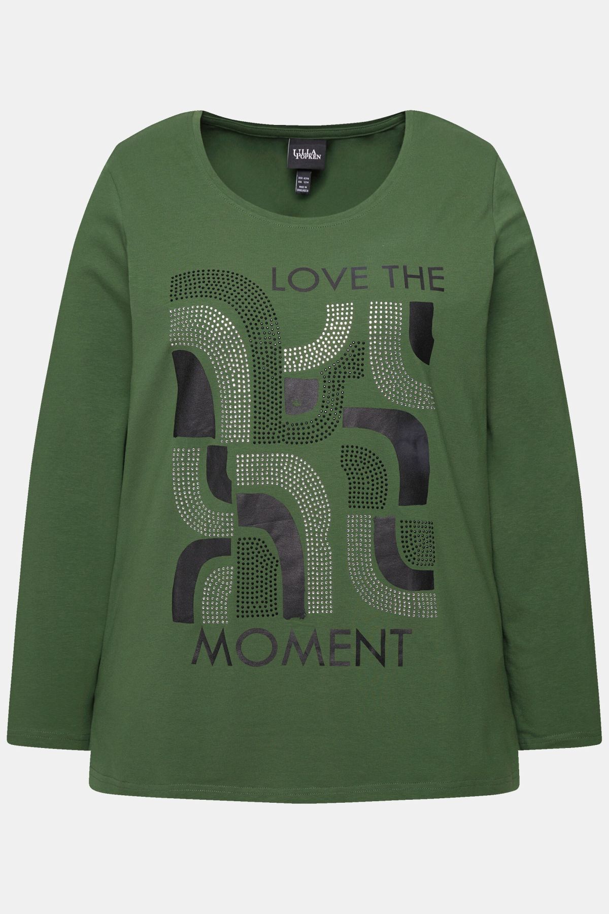 Geometric LOVE THE MOMENT Graphic Tee - Sparkling rhinestones and motivational lettering elevate this stretchy cotton style.