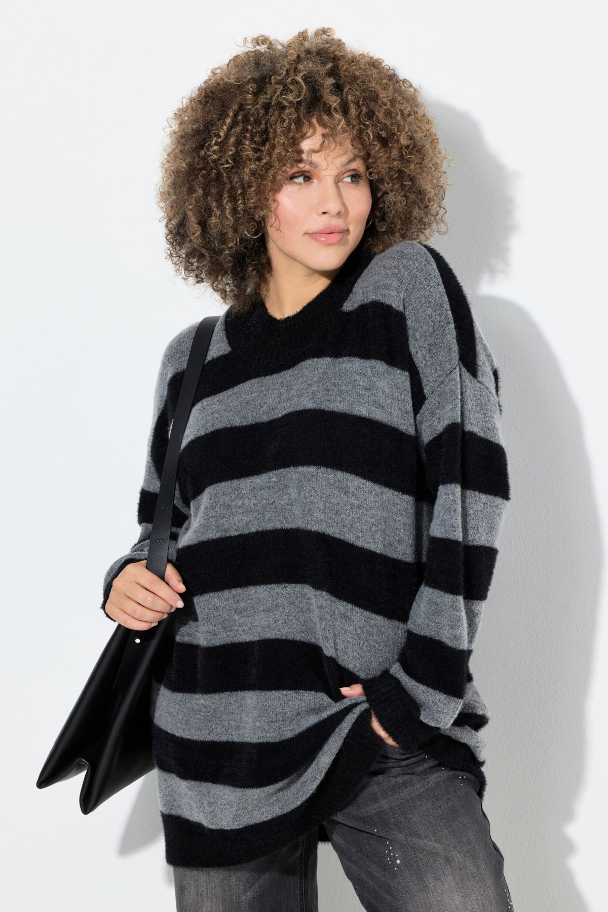 Модерни блокови райета, яка с изправена талия, удобна кройка с паднали рамене, оребрен подгъв и ръкави, мека, пухкава плетка с регулируема дължина приблизително 74-78 см.