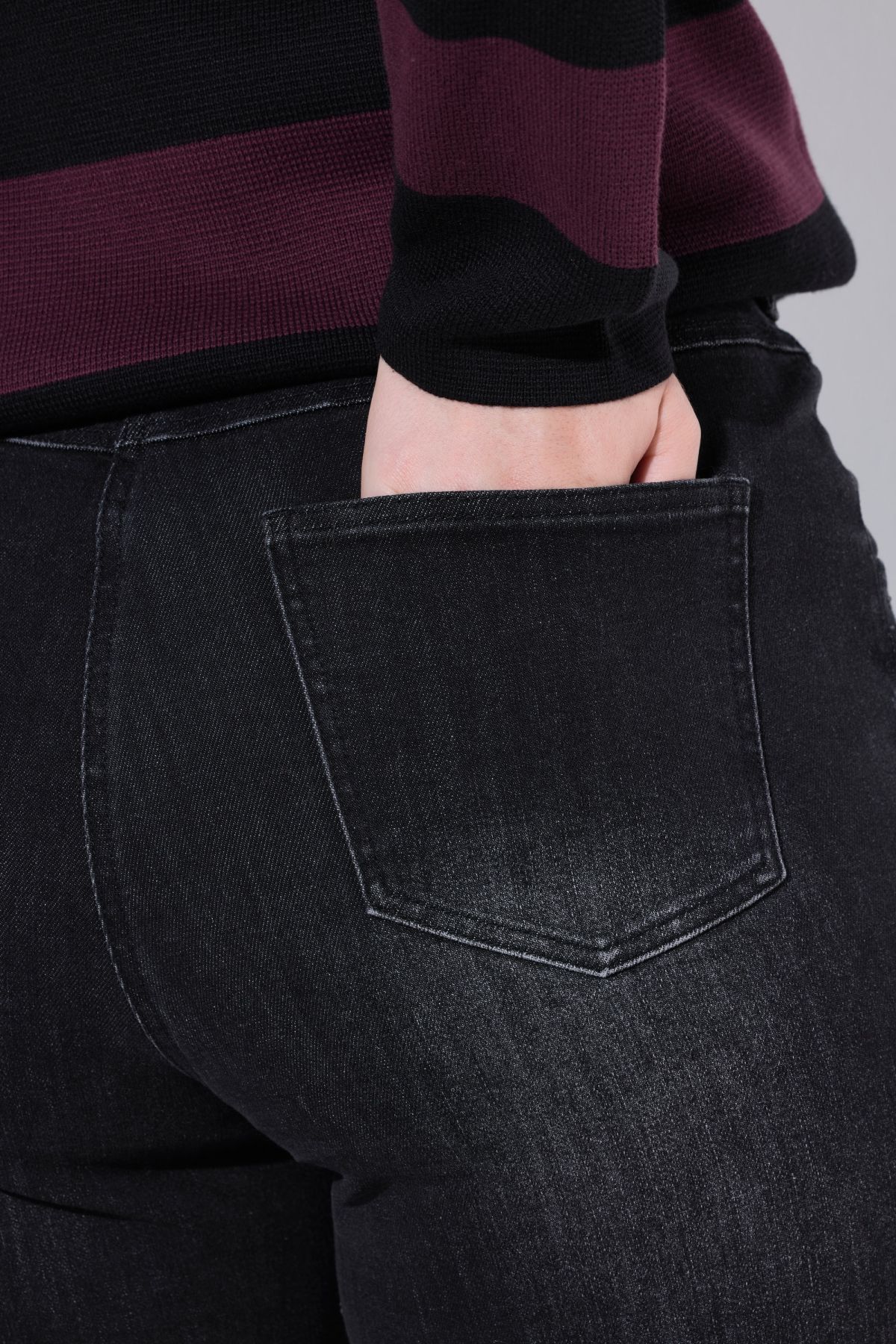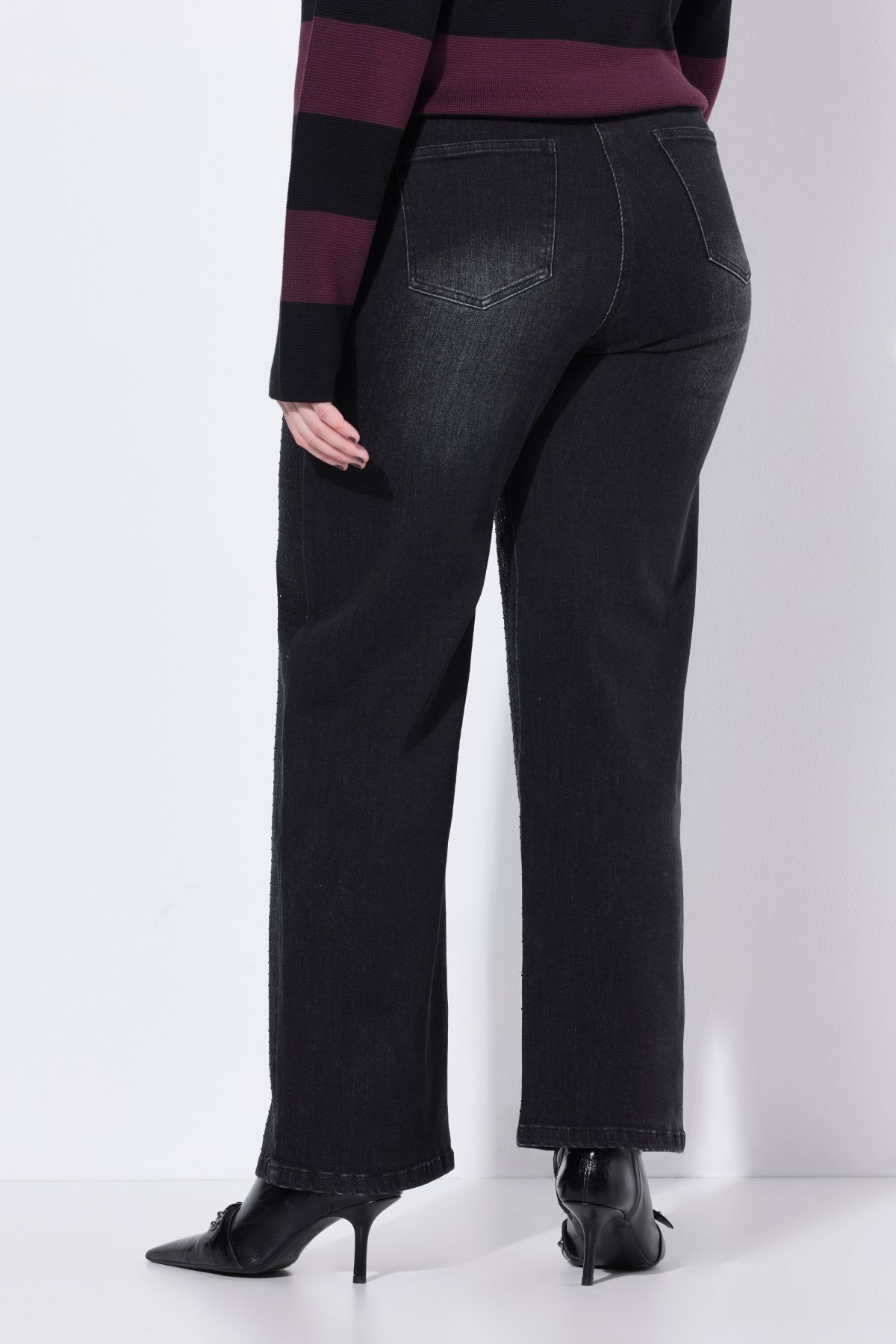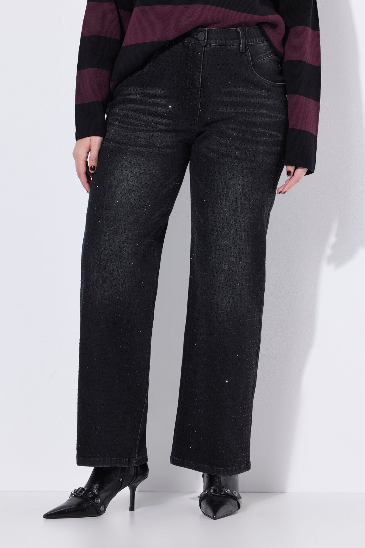 Изцяло украсен с кристали отпред, кройка „Мери“ с широки, прави крачоли, панталон с 4 джоба с копчета и цип, талия с гайки за колан, леко изпран деним, вътрешна дължина на крачола приблизително 82 см.