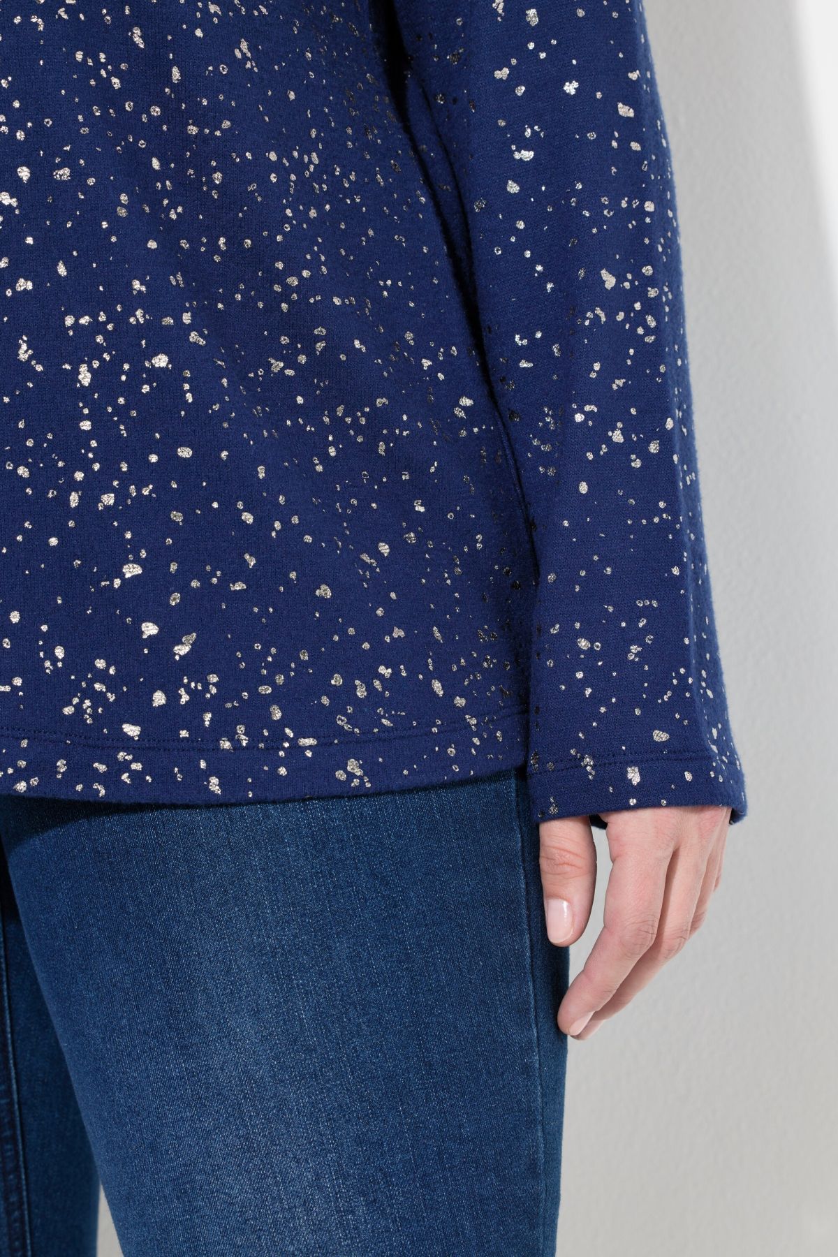 Блестящ металически принт, V-образно деколте, удобна кройка, леко спуснати рамене, дълги ръкави, регулирана дължина приблизително 68-76 см.