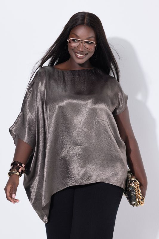 Shimmering Asymmetric Blouse - With a draped, cape-style silhouette for effortless elegance.
