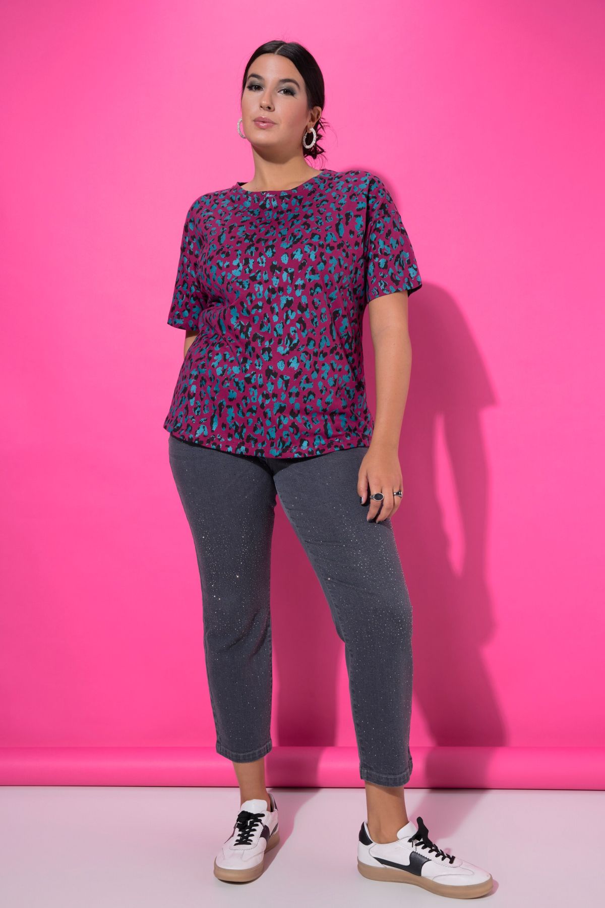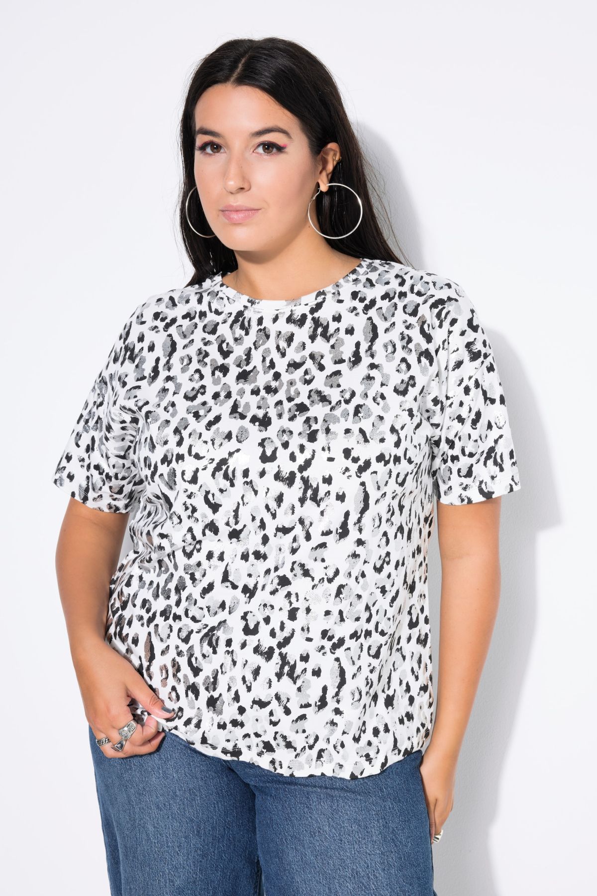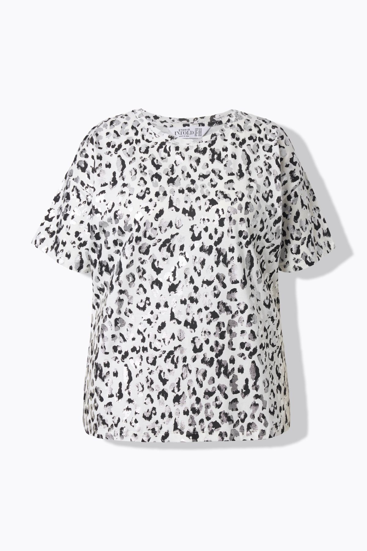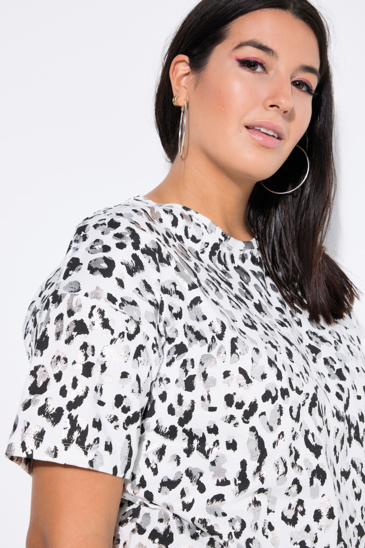 леко спуснати рамене, меко трико, сребрист леопардов принт, къси ръкави, дължина, регулирана по размер, приблизително 65-73 см.