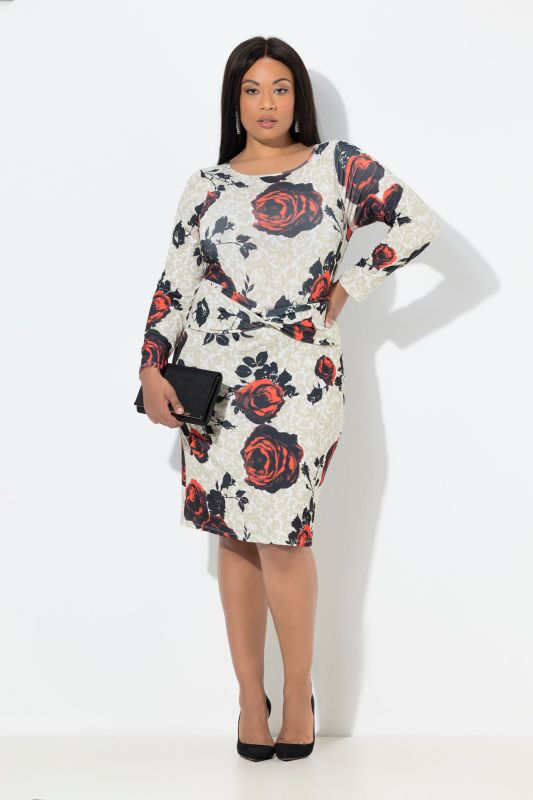 Едър розов мотив, деколте тип „лодка“, дълбоко V-образно деколте на гърба, прилепнала, дълги ръкави, драпирана талия с колан за завързване, дължина приблизително 110-114 см.