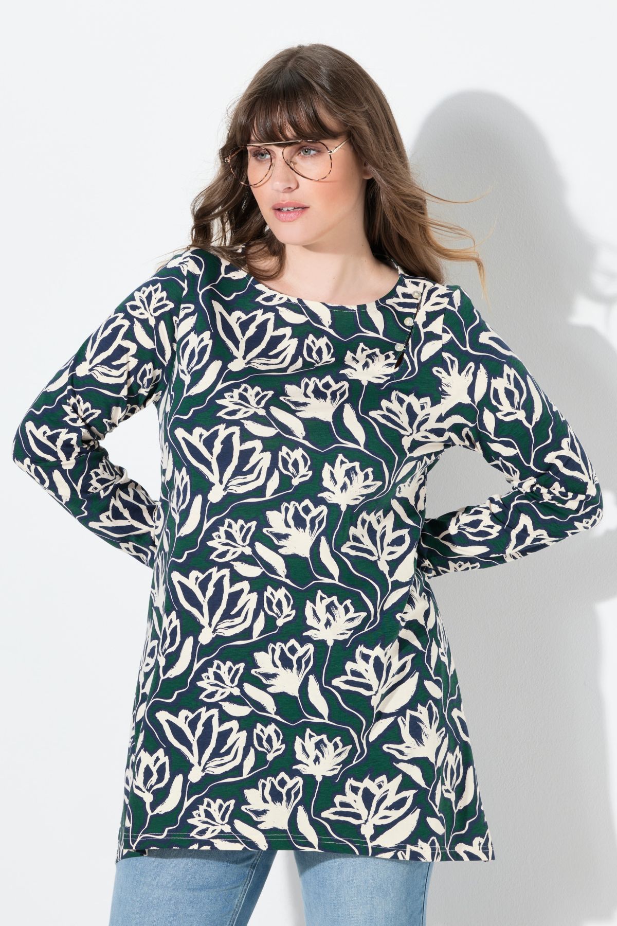 едър флорален мотив, деколте тип „лодка“, страничен цепка, декоративни копчета, А-силует с модерен заострен подгъв, дълги ръкави, устойчив органичен памук, дължина, регулирана по размер, приблизително 76-80 см.