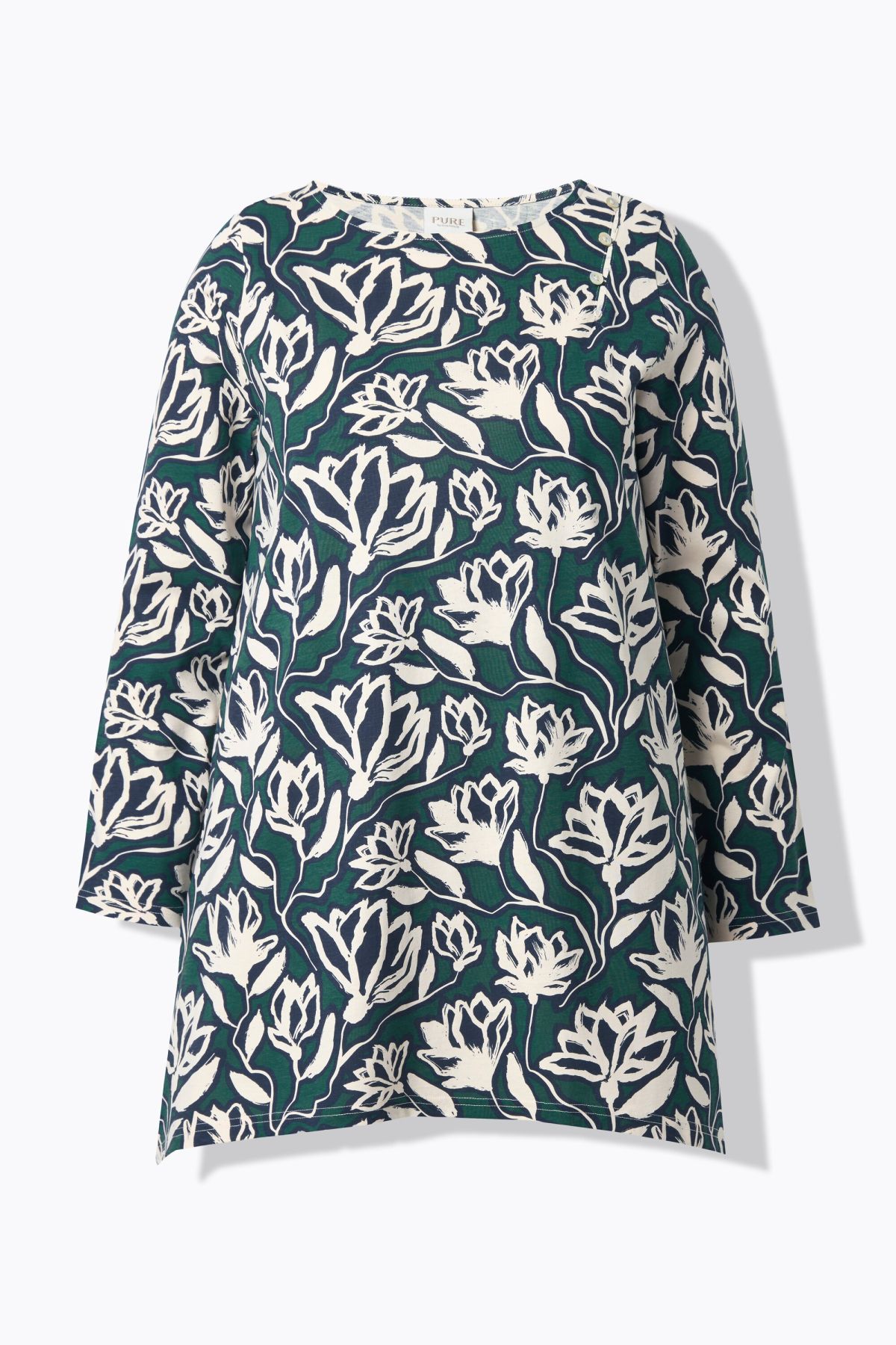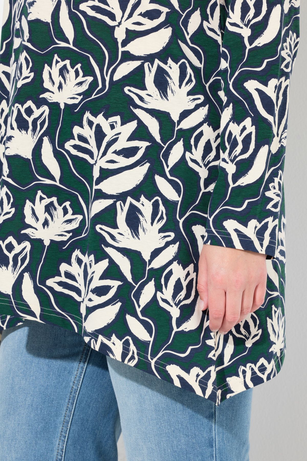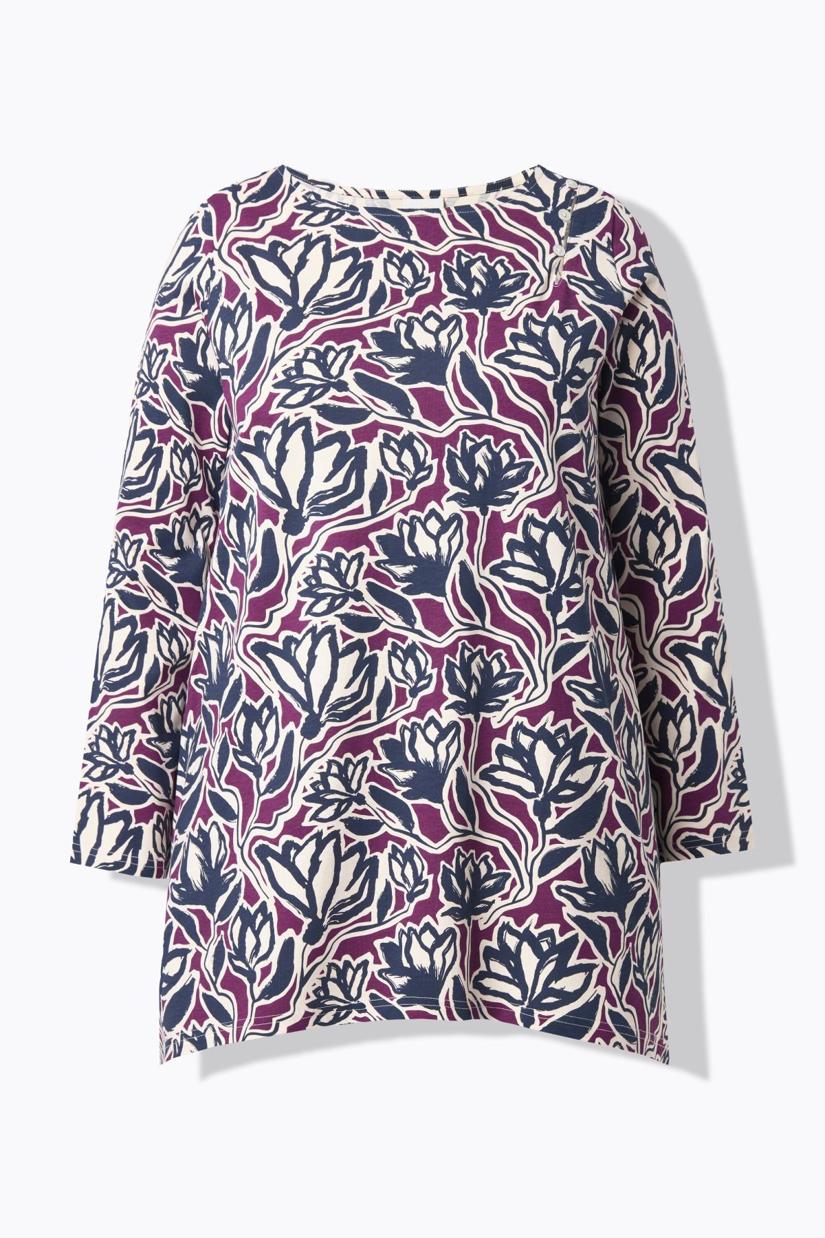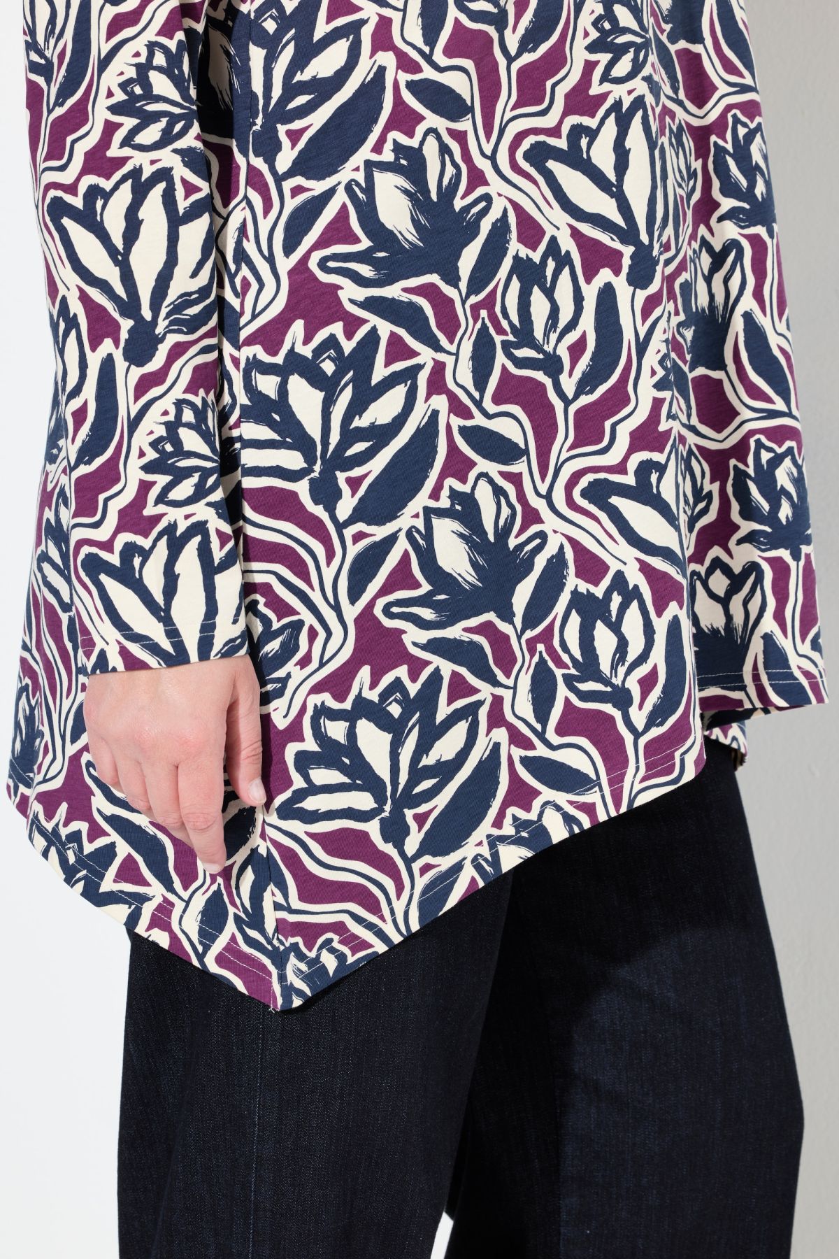 Eco Cotton Flower Print Tee - A dramatic pointed hemline and boat neck style make this a must-have.