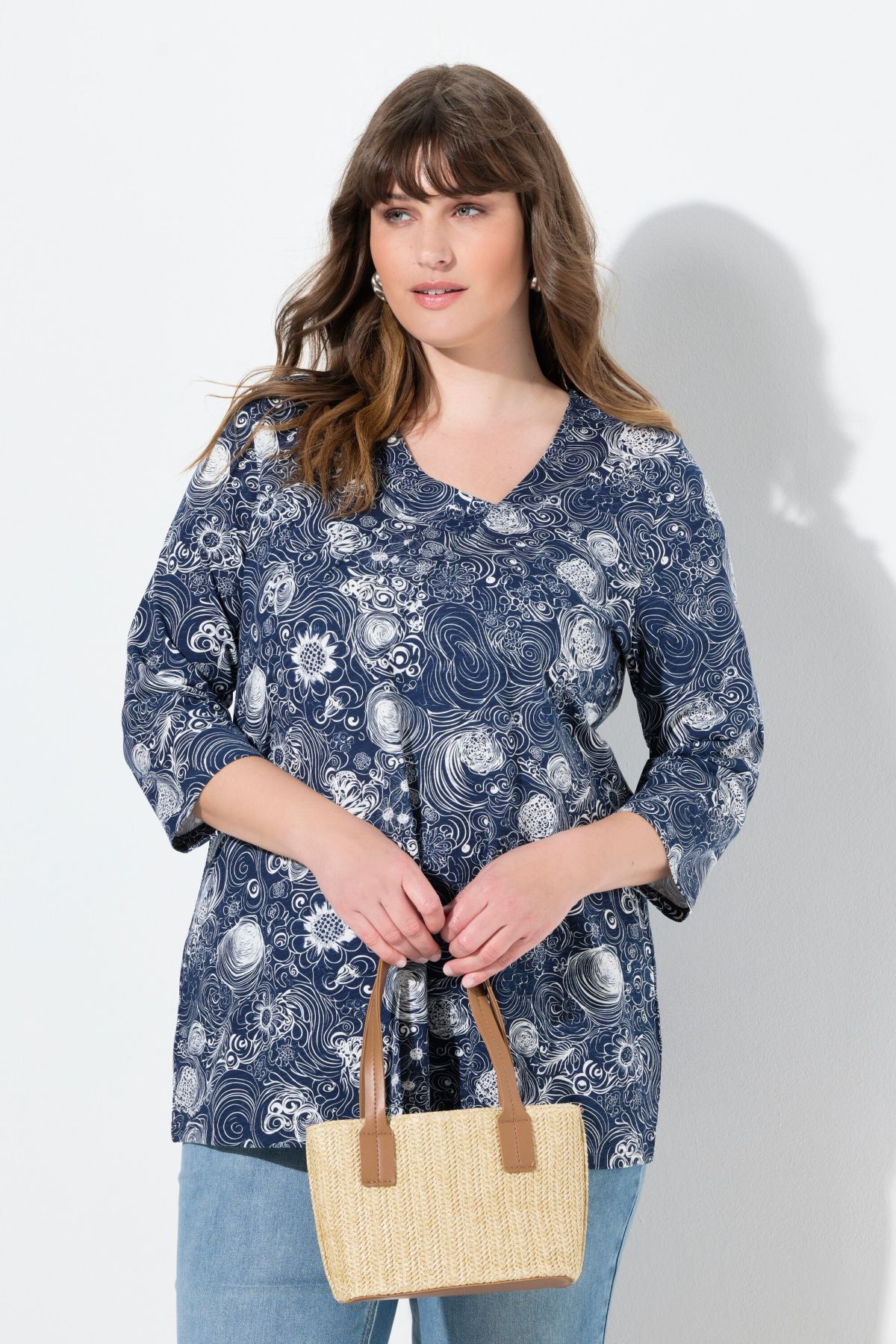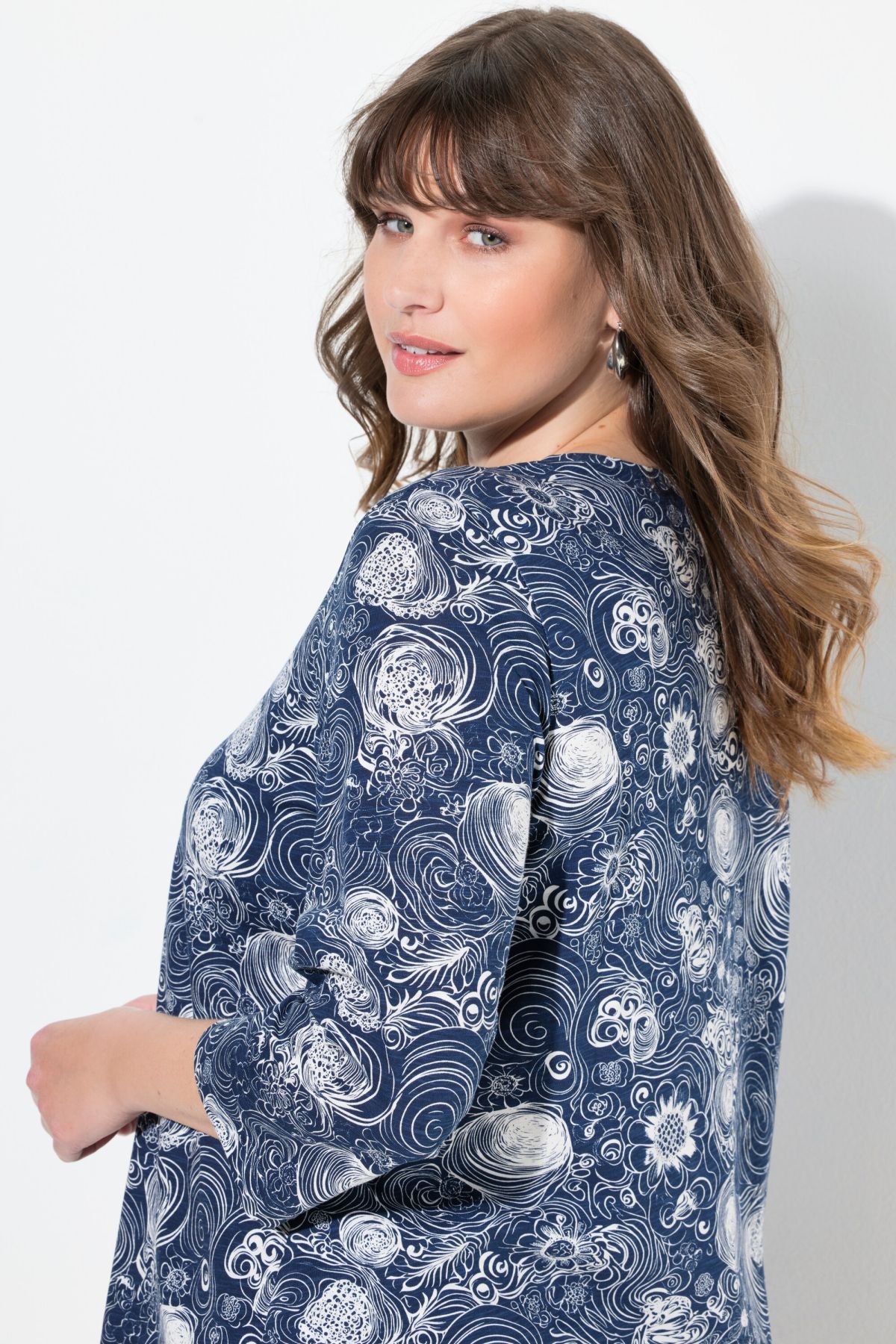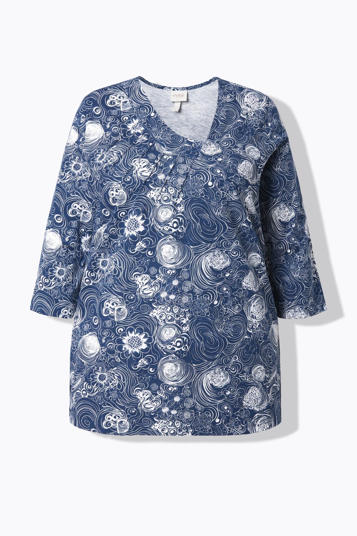 Флорален мотив и модерни плисета, асиметрично V-образно деколте с подплата, удобен А-силует, широки 3/4 ръкави, устойчив органичен памук, дължина, регулирана по размер, приблизително 72-76 см.