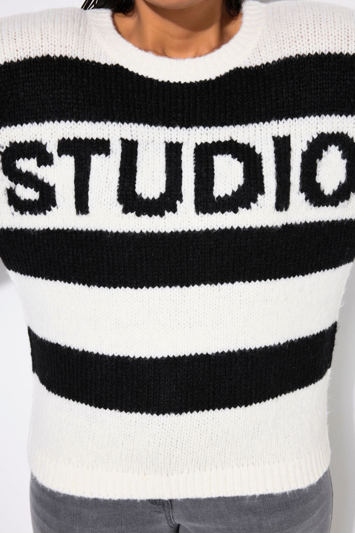 Sweater, oversized shape, made of soft knit with block stripes and STUDIO statement. Round neck, dropped shoulders, long sleeves. Ribbed cuffs.
