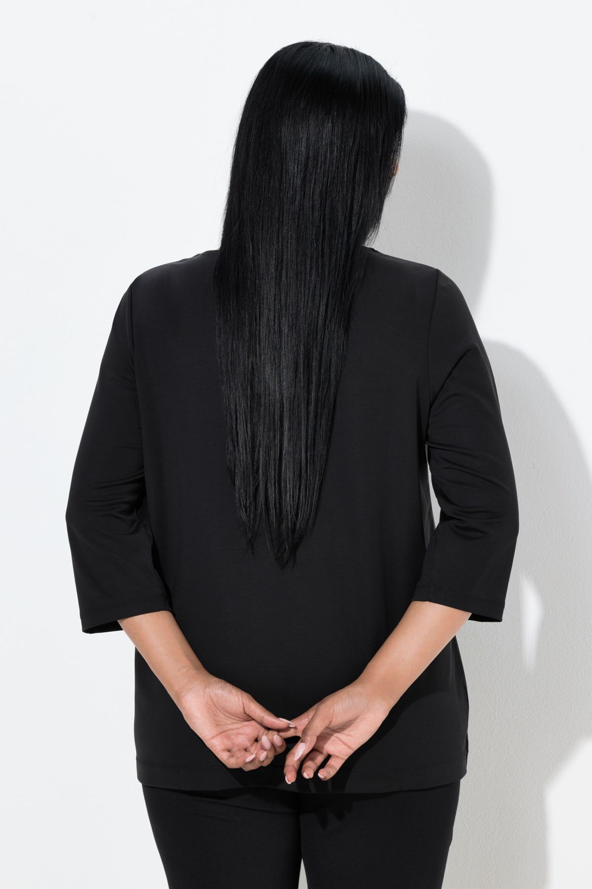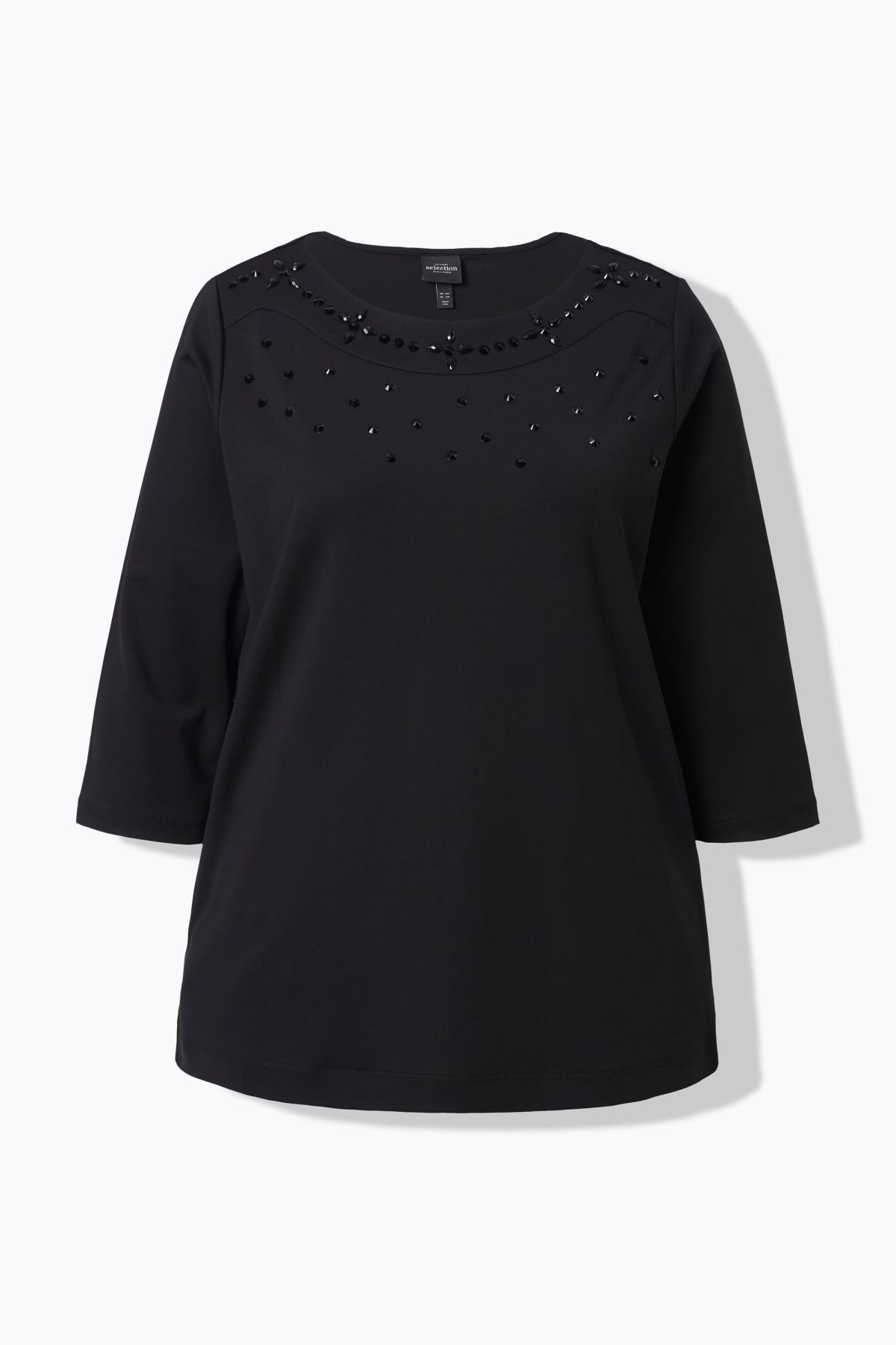 Rhinestone Studded Tee - Sparkling tonal rhinestone line the collar of this 3/4 sleeve style.