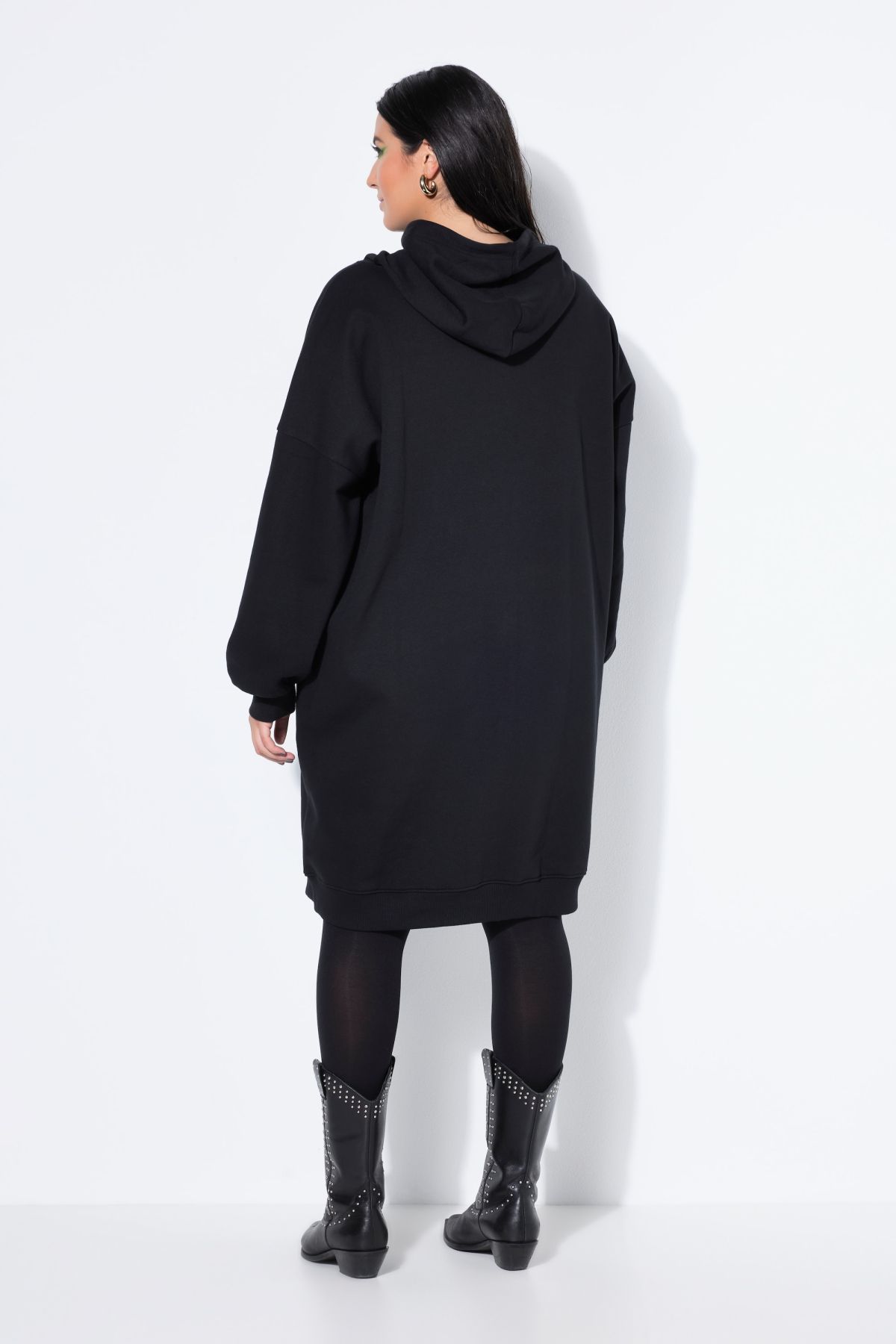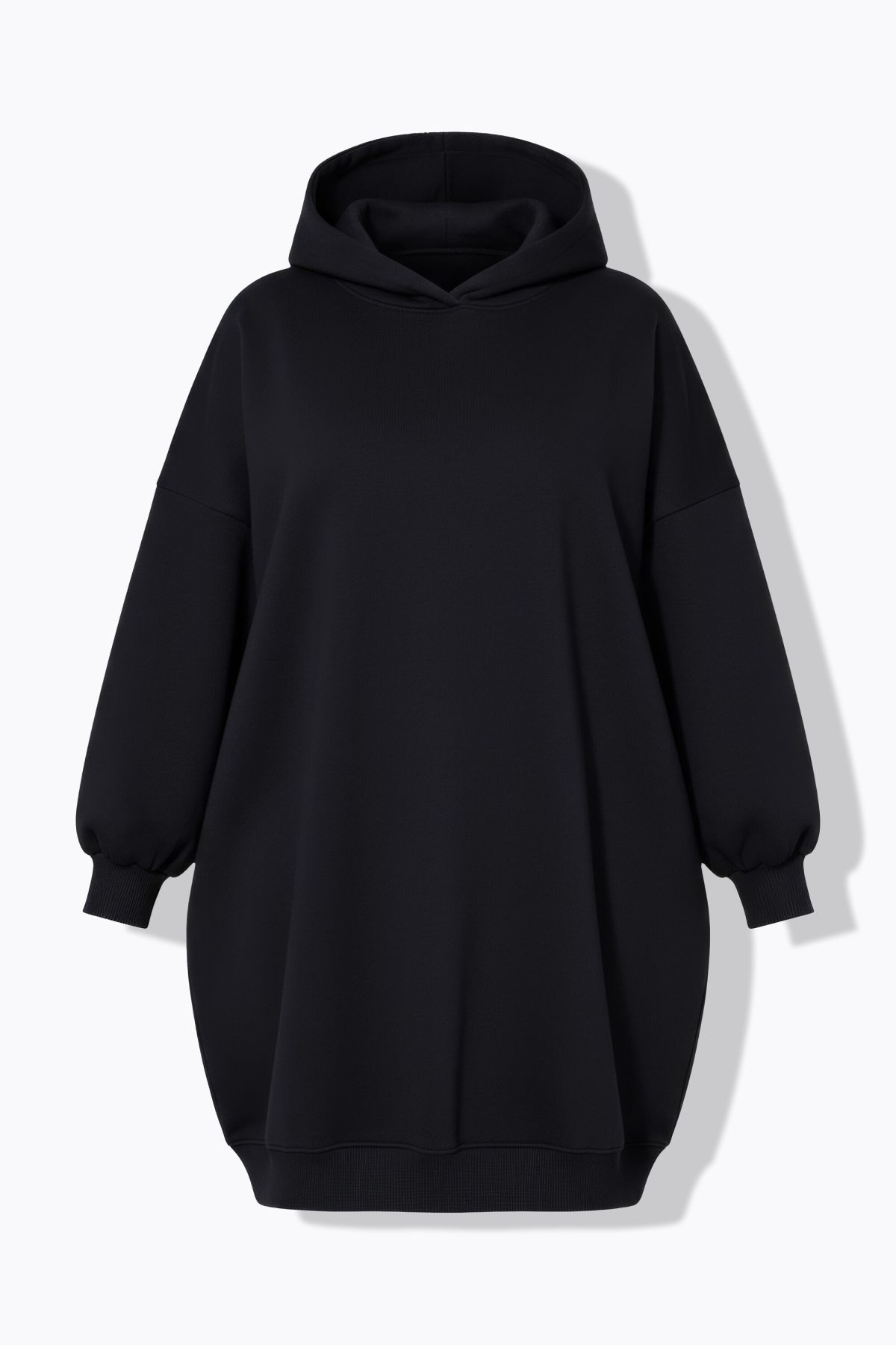 Оувърсайз кройка, мека материя за суитчър, качулка, дълги балон ръкави, дължина, регулирана по размер, приблизително 97 см.