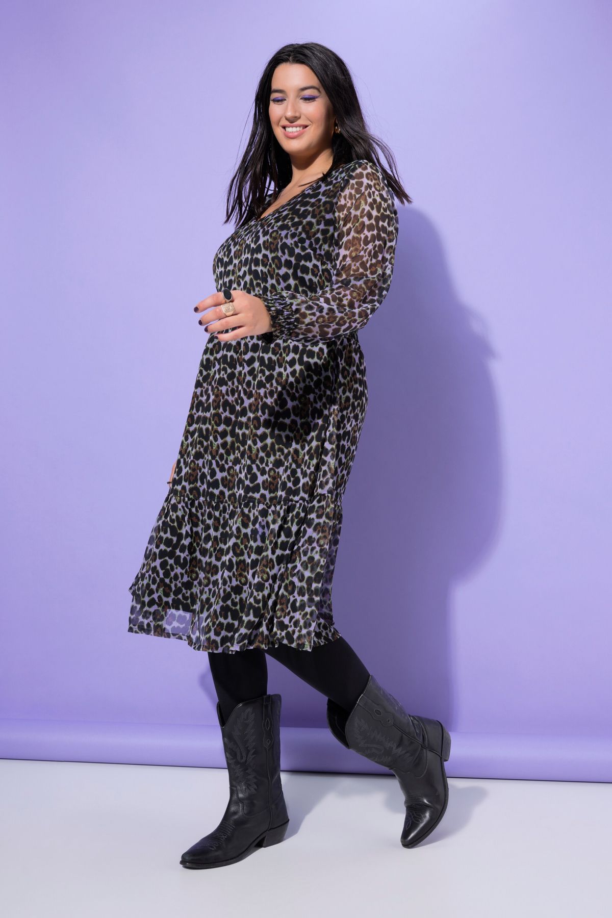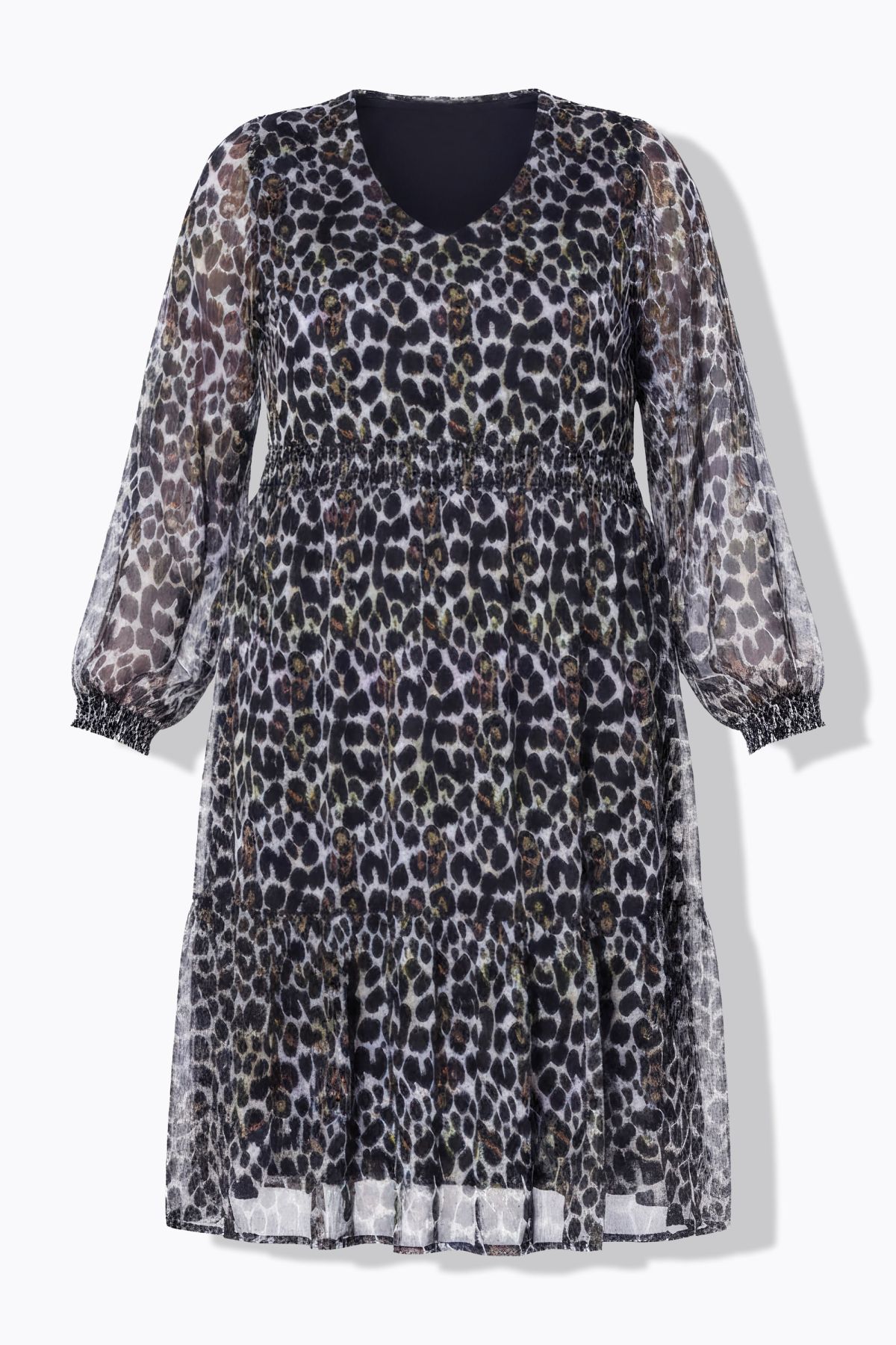 Midi dress, A-line, double layered, leopard print, hem flounce