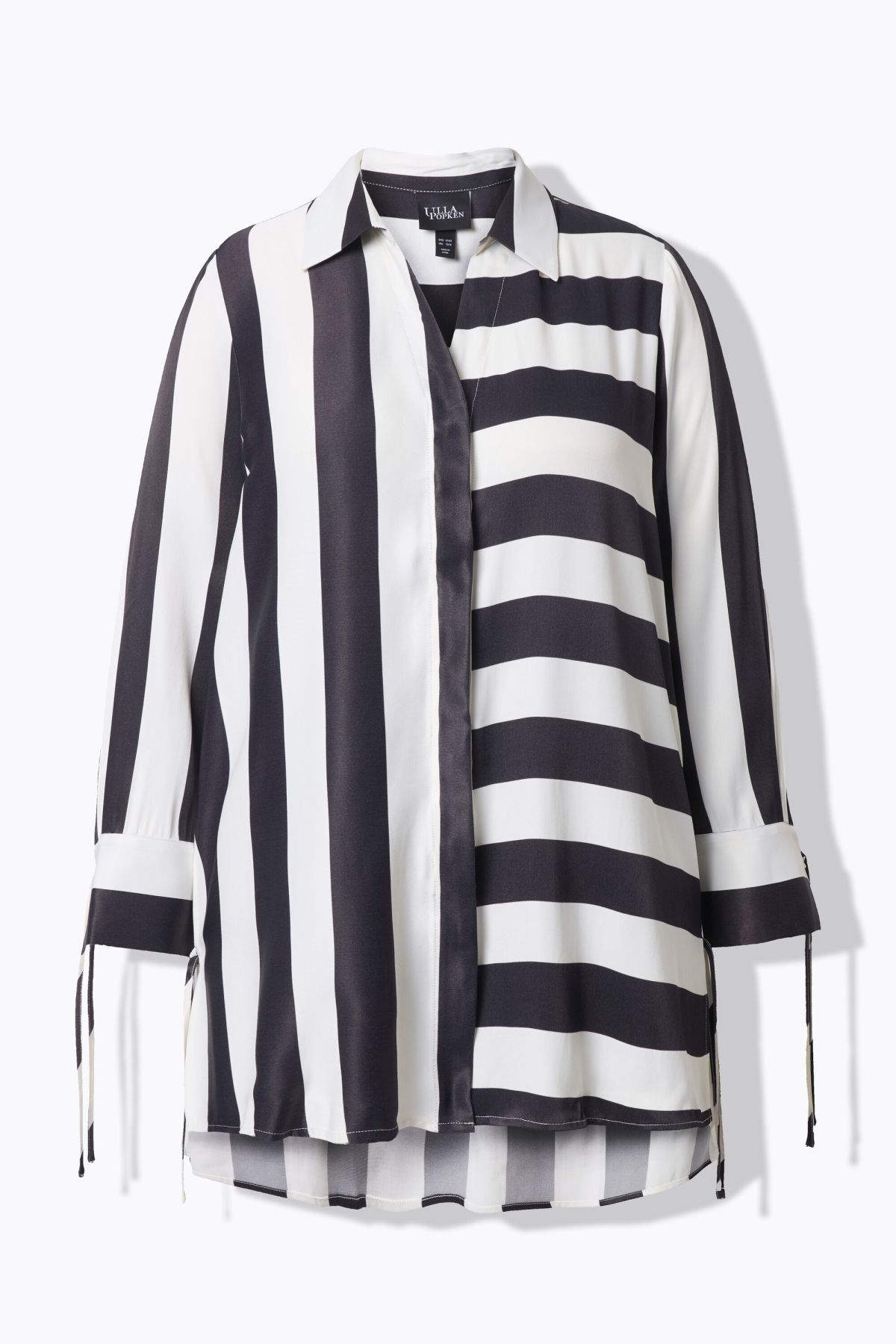 Mixed Stripe Tunic Blouse - this bold mix of black and white stripes will show off your trendy style! Open shirt collar, hidden button placket, long sleeves with adjustable tie cuffs, extended length back hem, and back yoke with gathers.
