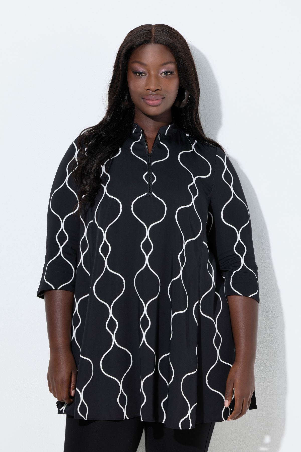 Ogee Print Satin Tunic With wide godet pleats for a flattering flared silhouette.
