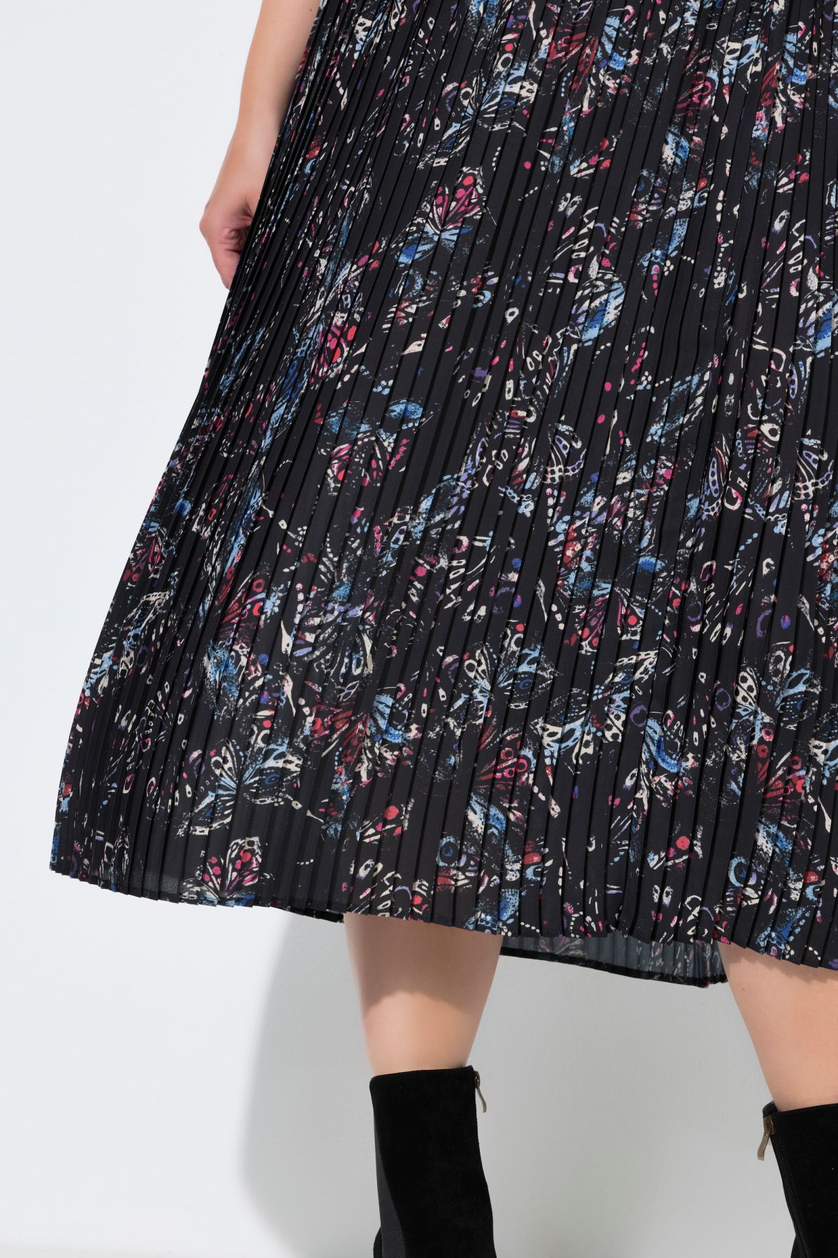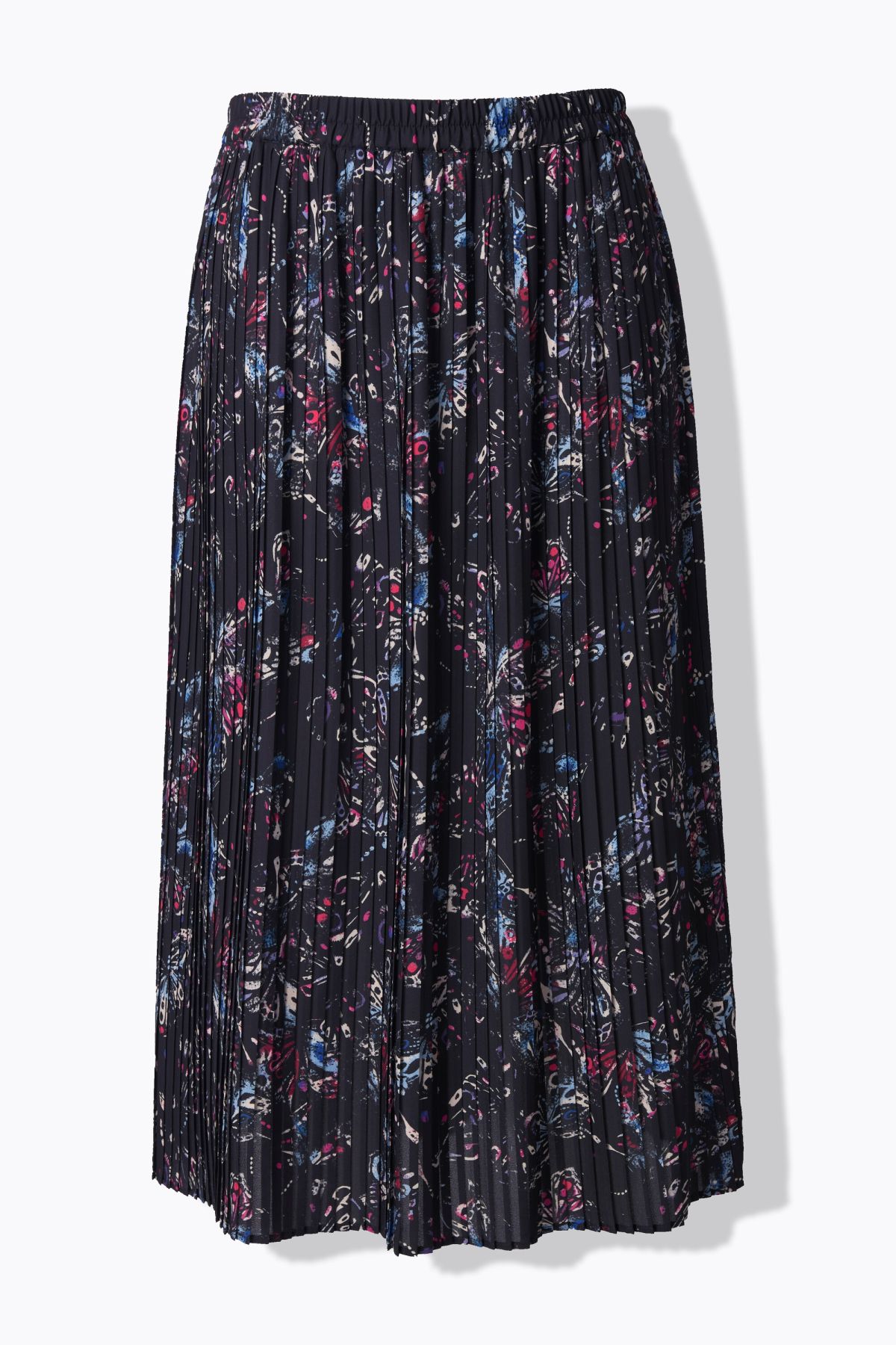 Изработена от ефирна плисирана материя, декоративен модел пеперуда, А-силует с комфортна ширина на подгъва, удобна еластична талия, непрозрачна подплата, дължина приблизително 84 см.