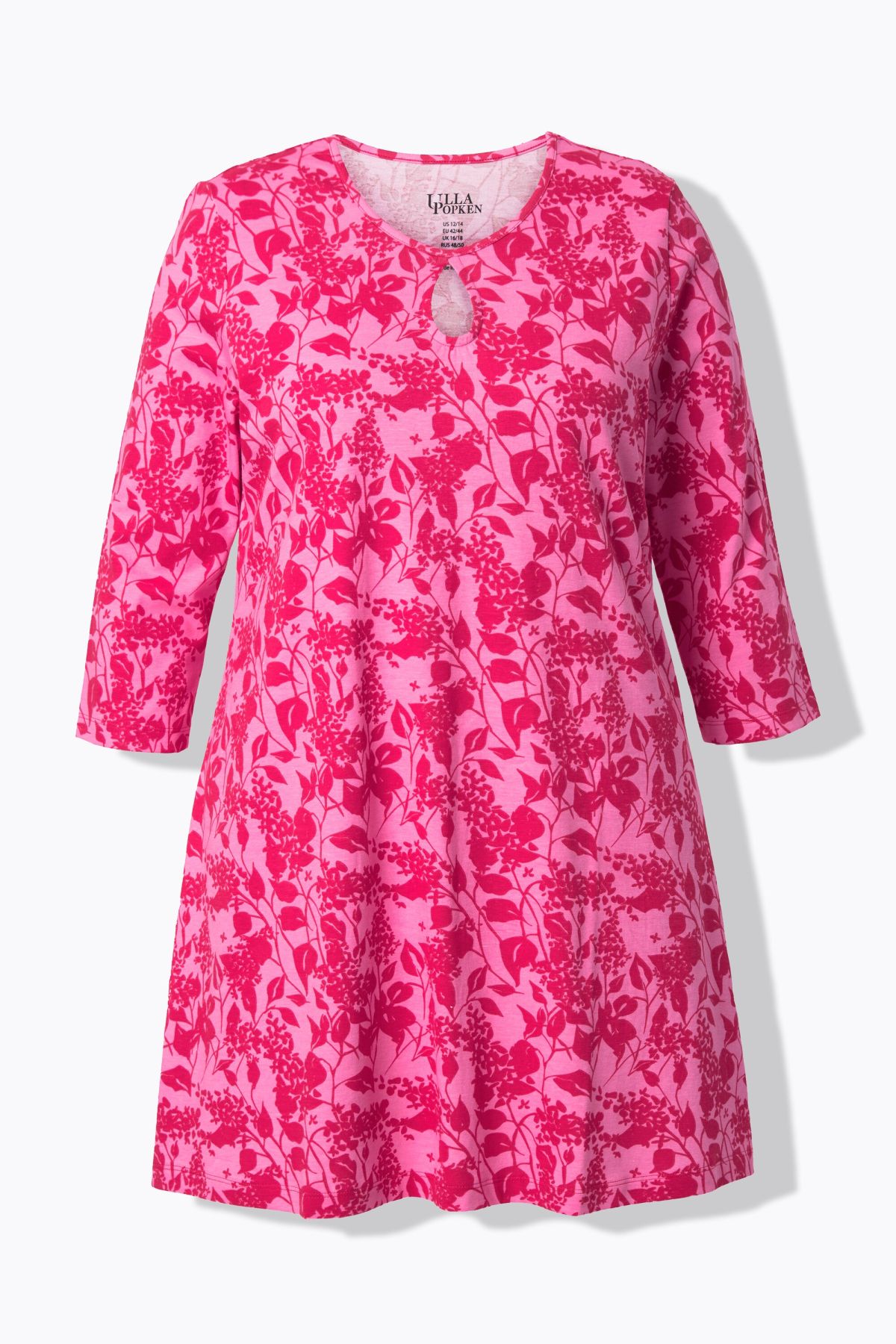 Атрактивен флорален мотив, кръгло деколте с малък изрез, по-дълъг А-силует с удобно широк подгъв, 3/4 ръкави, чист памук, дължина приблизително 86 см.