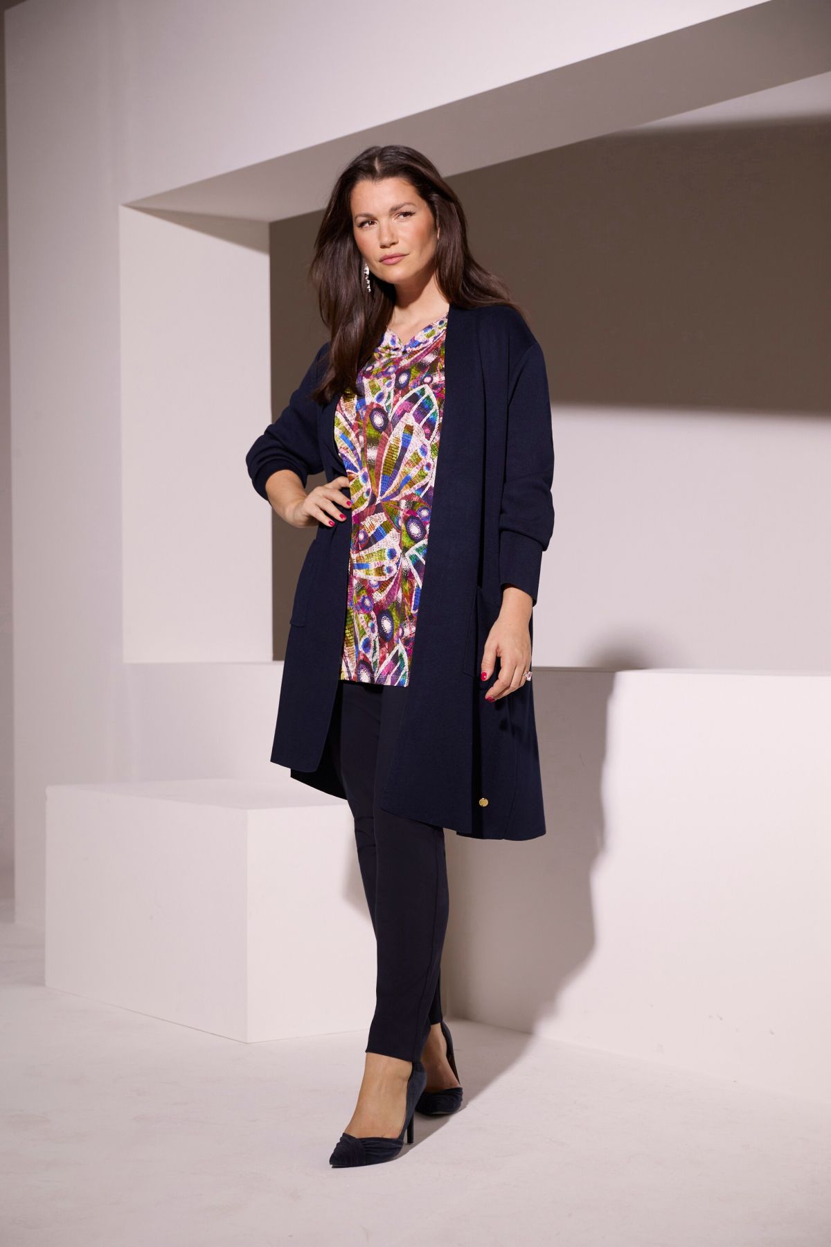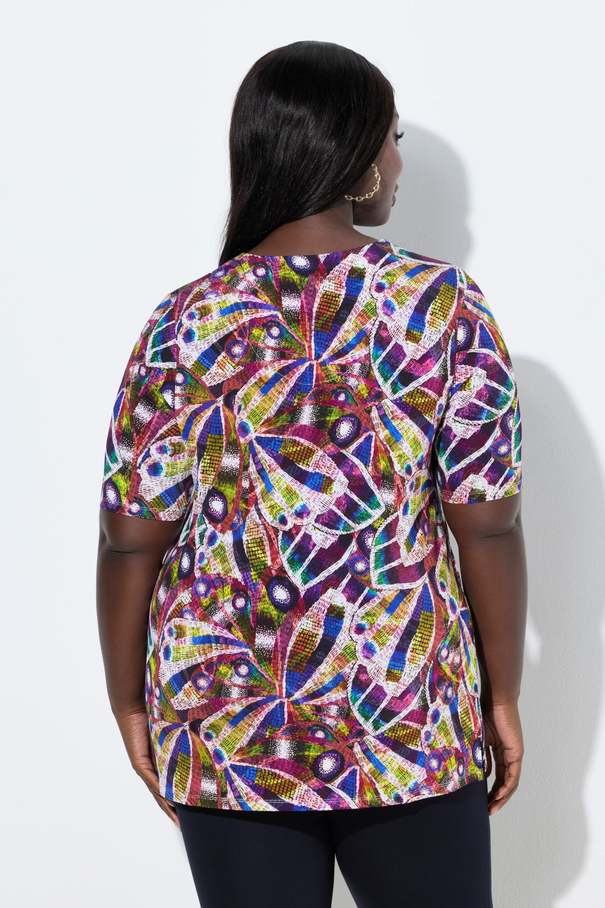 Graphic Peacock Print Slinky Top A heavy, stretch knit fabric with a smooth, effortless drape.
