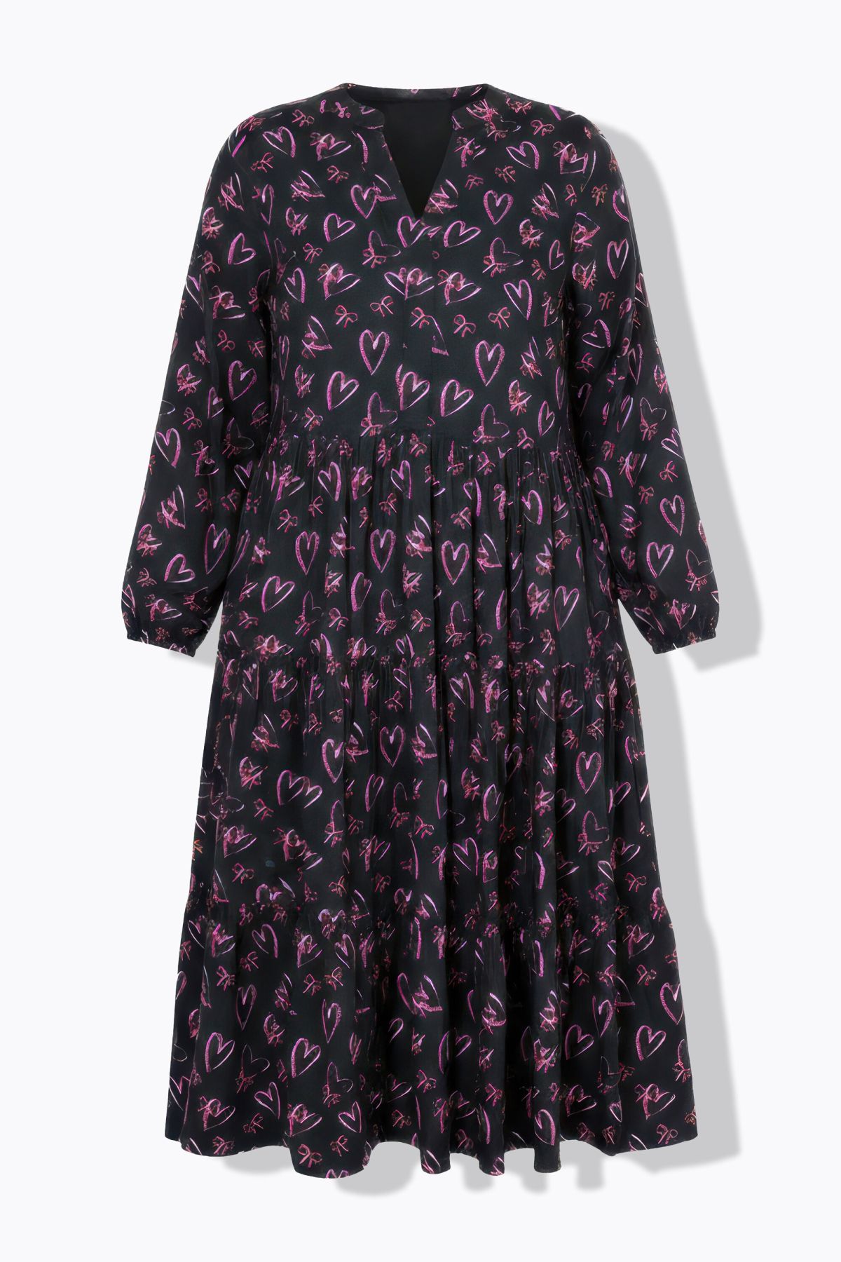 удобна кройка, щампа с панделка във формата на сърце, яка с V-образно деколте, широки дълги ръкави, волани, дължина приблизително 120 см.