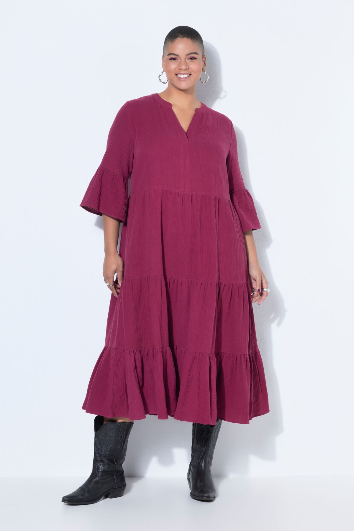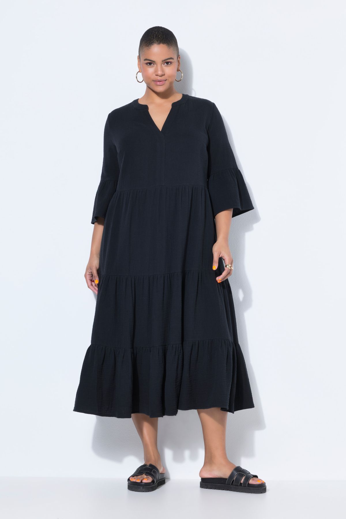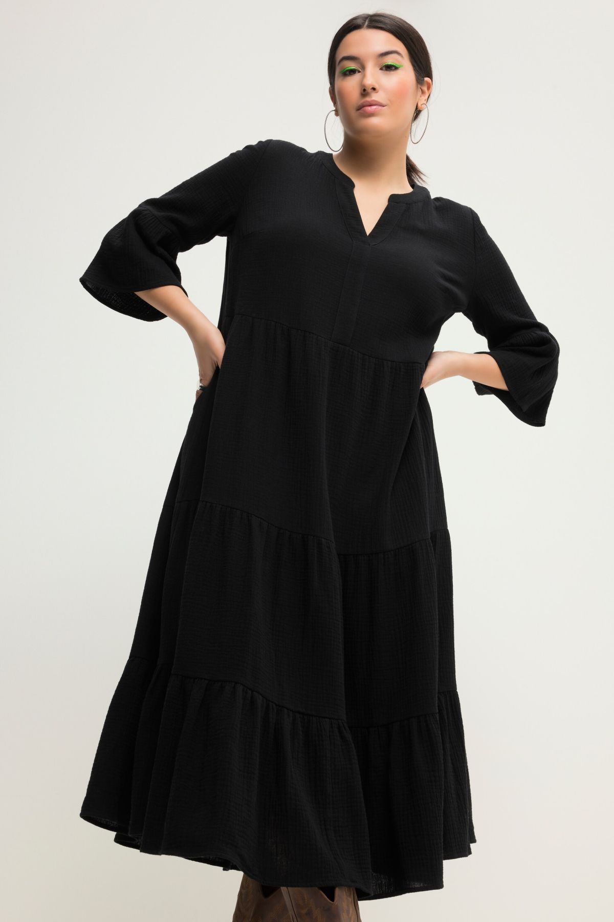 Maxi dress, A-line, muslin, stand-up collar, flounces, 3/4 sleeves