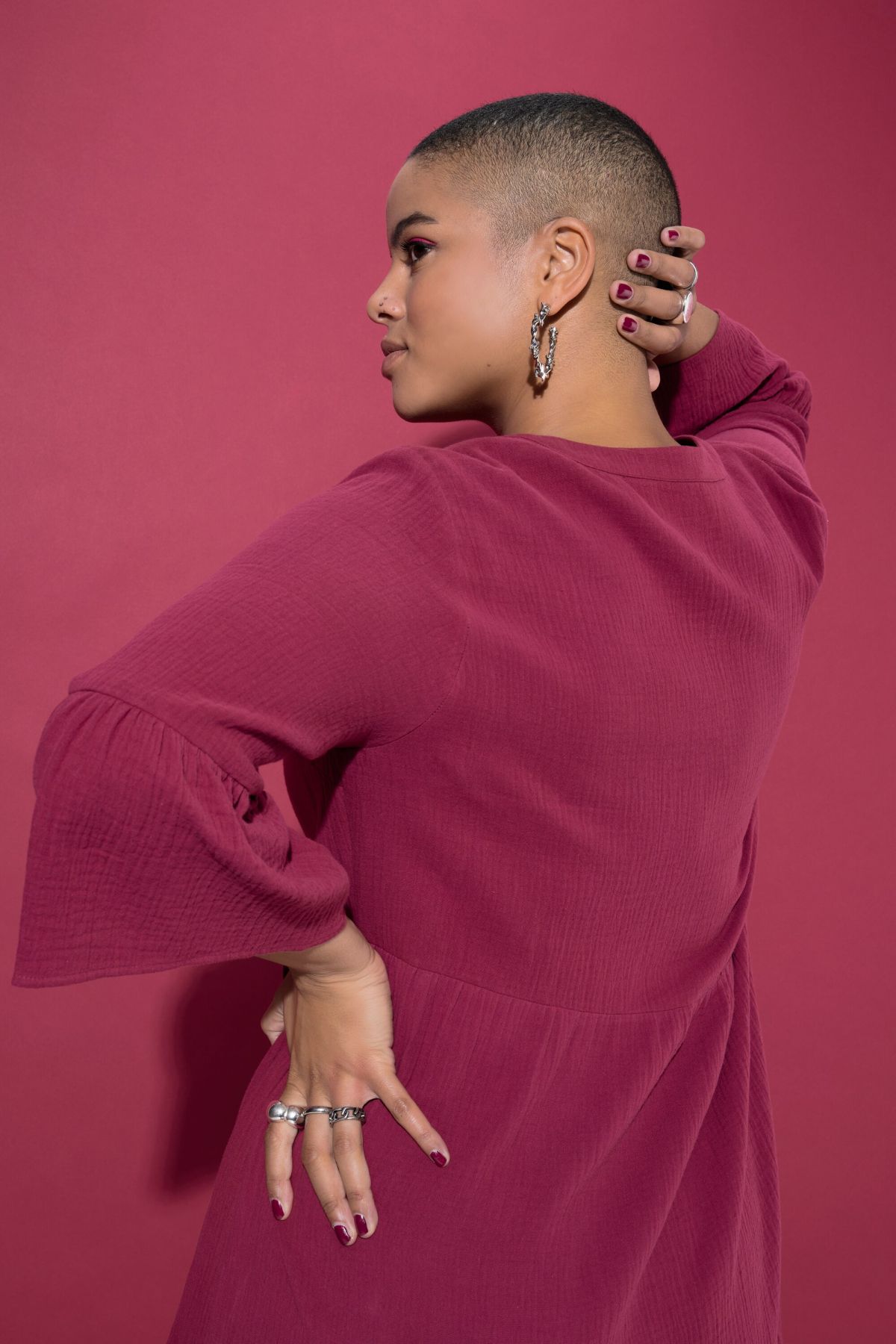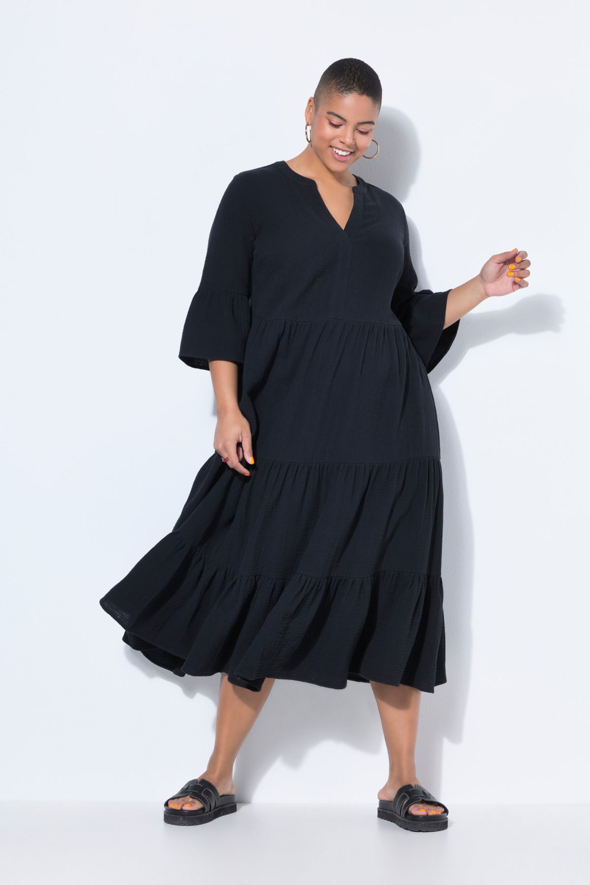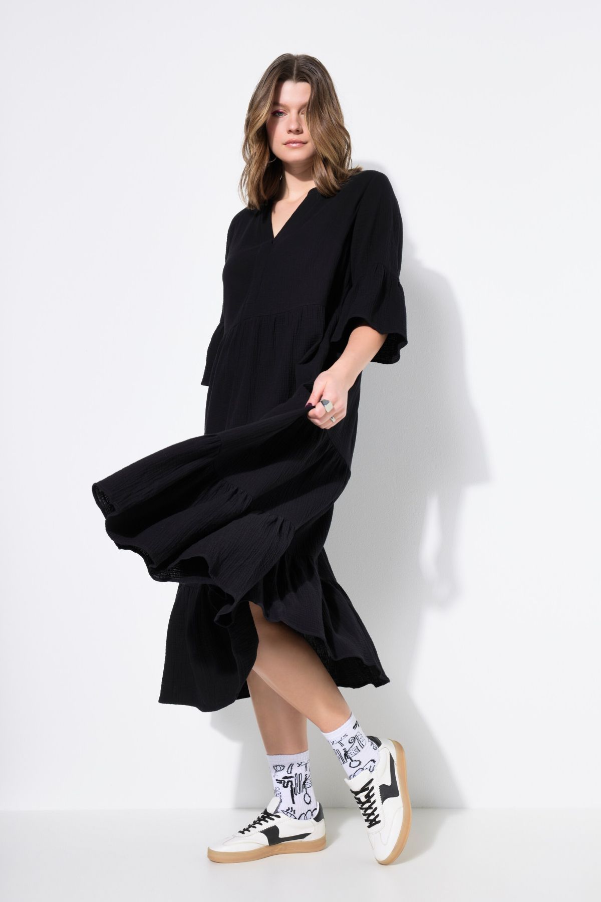 Maxi dress, A-line, made of soft muslin - totally on trend, super comfortable on the skin. Long, wide shape with stand-up collar, V-neck and double flounce at the hem. 3/4 statement sleeves with wide ruffle.