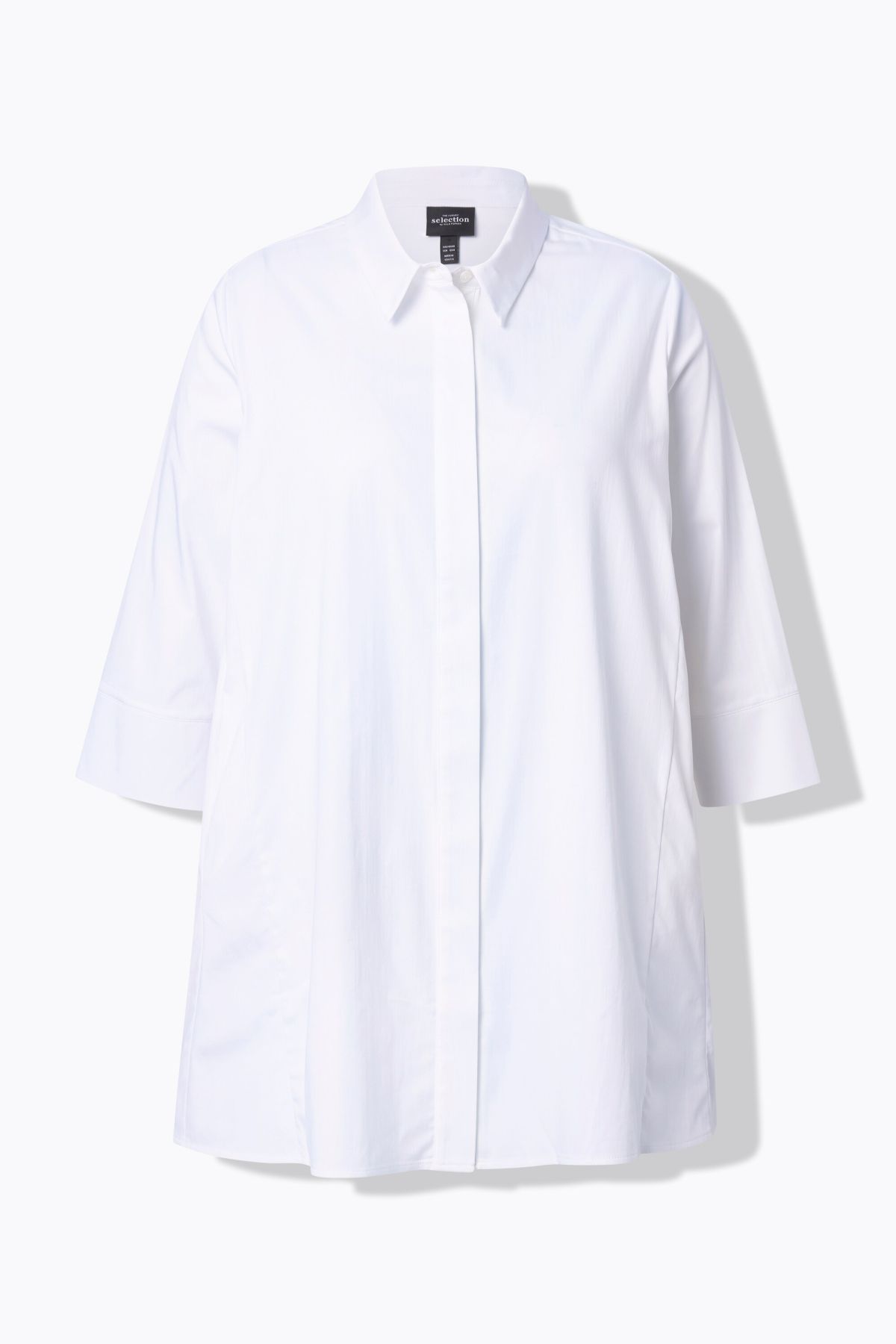Swing Hem Stretch Shirt# swing into style with this classic look updated with godets to create a swing hem. Shirt collar, hidden button placket, 3/4 vented cuff sleeves, and side seam pockets. Woven stretch cotton blend.