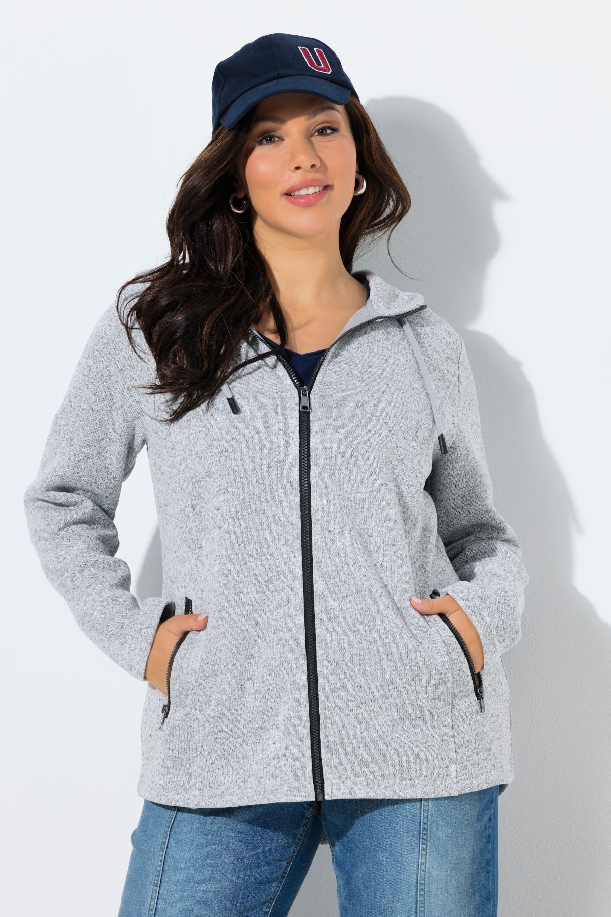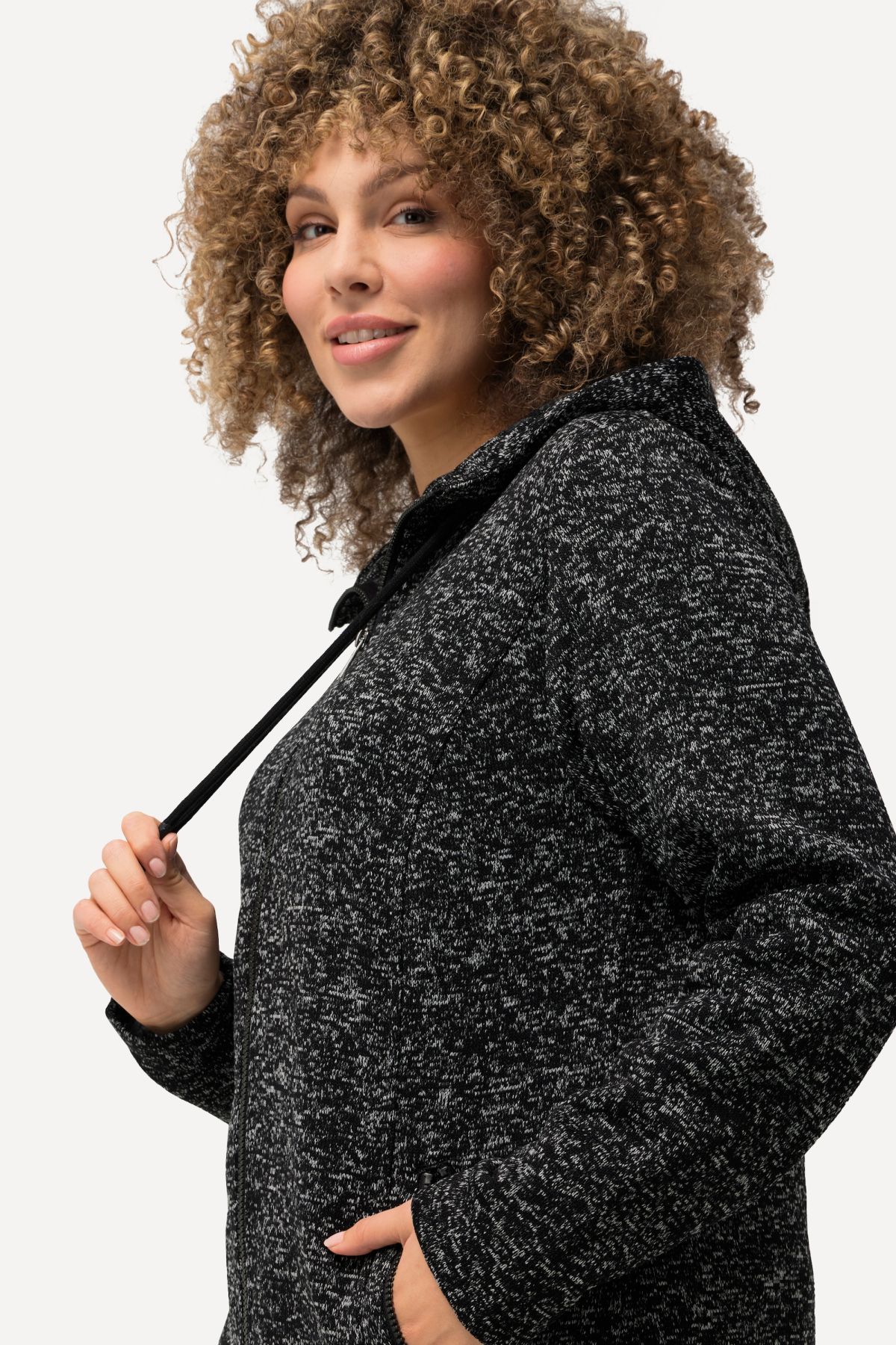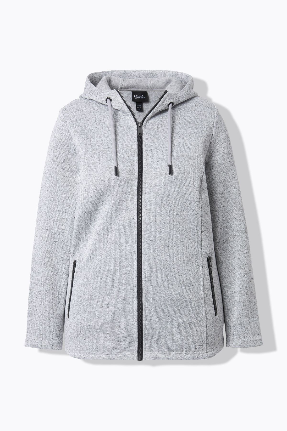 Melange Knit Jacket# this cozy jacket is lined with soft fleece for extra warmth and comfort. Attached hood with tie, long sleeves, zipper closure, mottled knit exterior, cuddly fleece interior, zippered pockets.