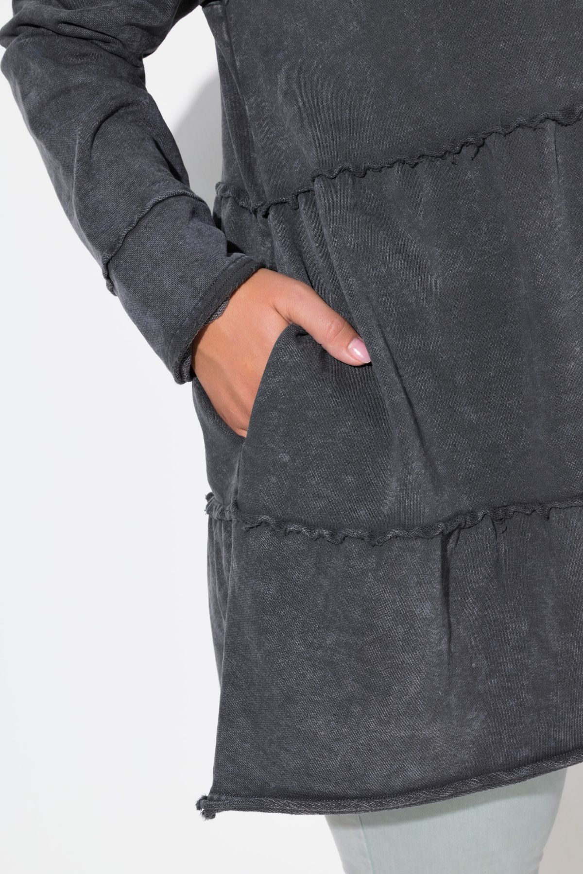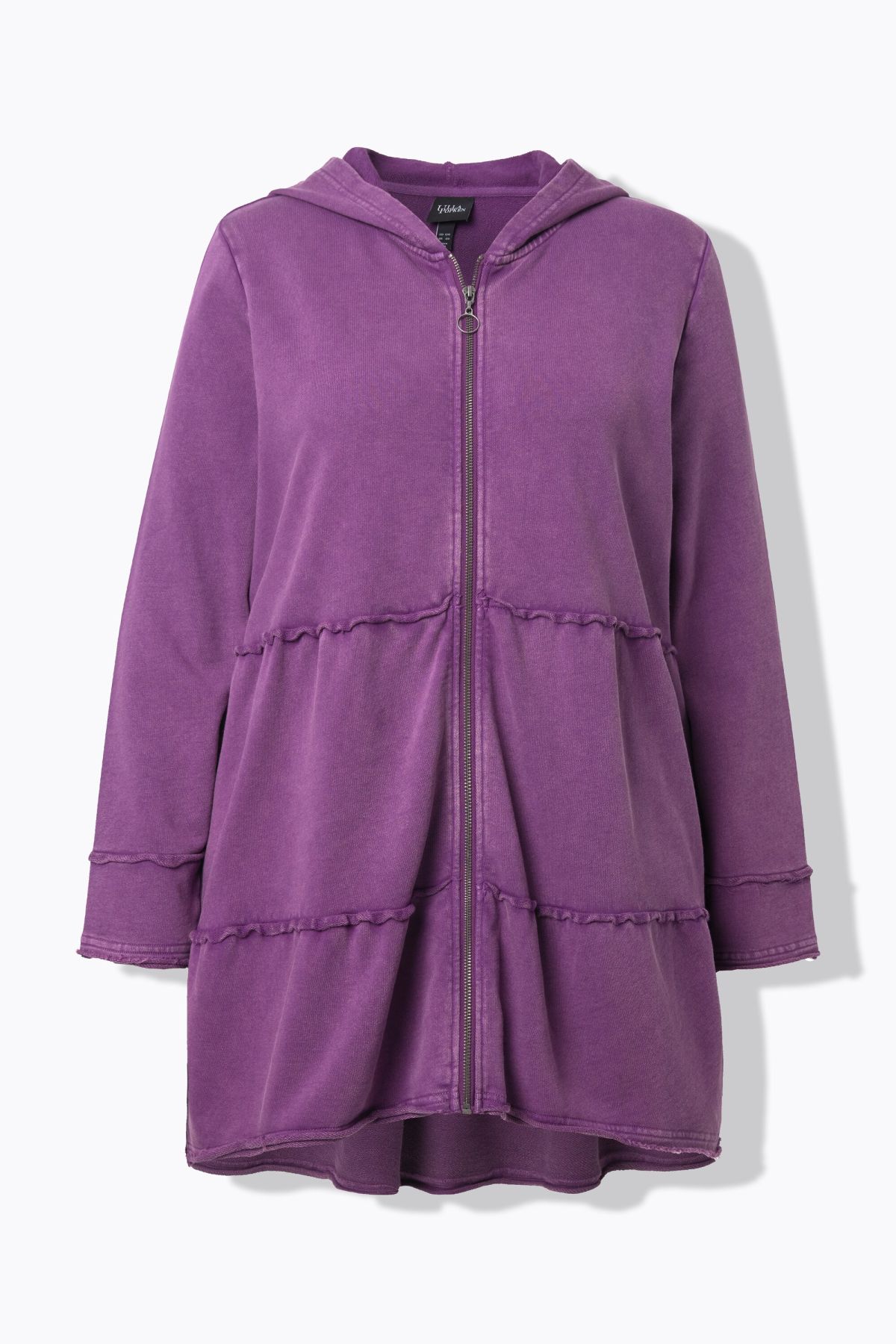 Tiered Flounce Panel Hoodie - Tiered flounce panel hemlines add playful volume to this trendy acid-wash design.