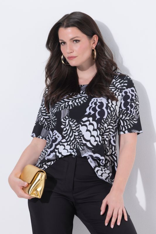 Mixed Floral Print Stretch Knit Slinky Top A modern black and white print with artistic flair.
