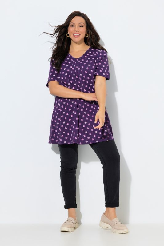 Pleated Polka Dot Knit Tunic Playful polka dots with a pleated cross seam for a flared a-line silhouette.
