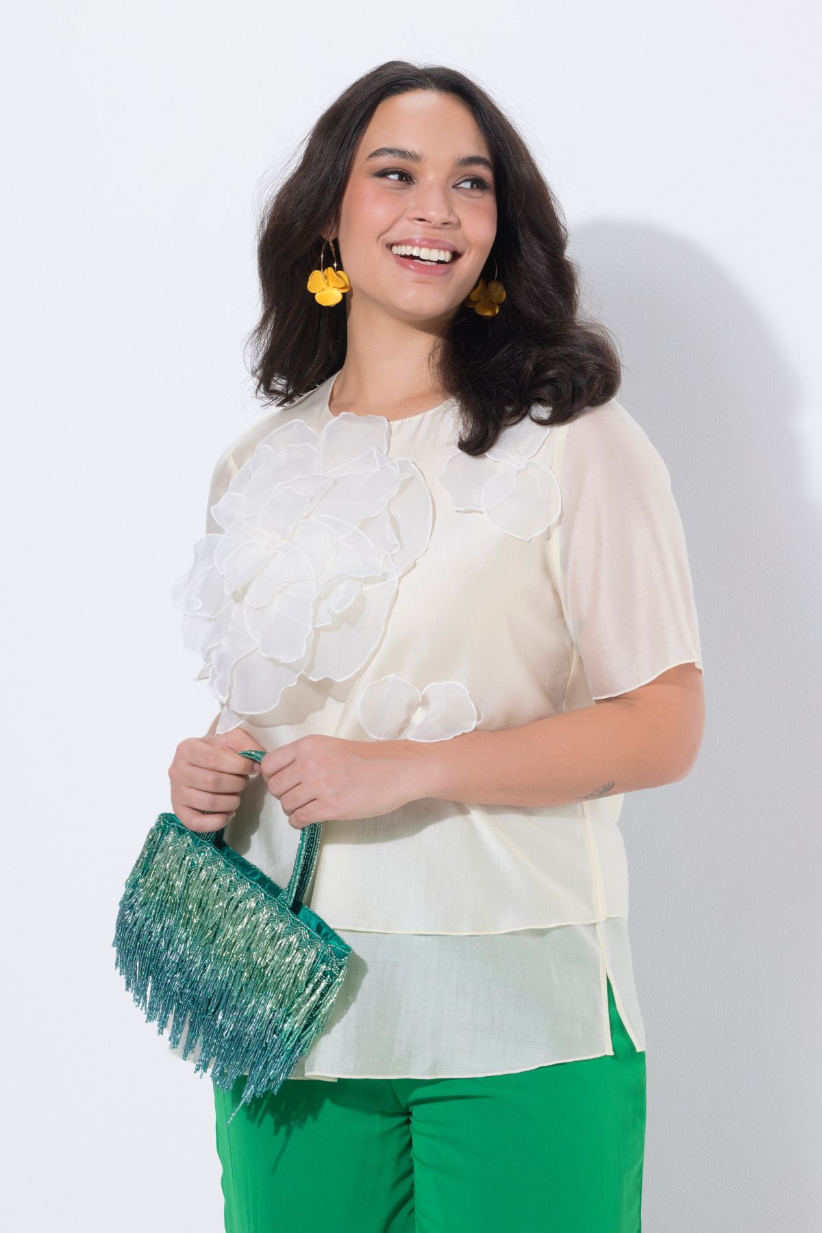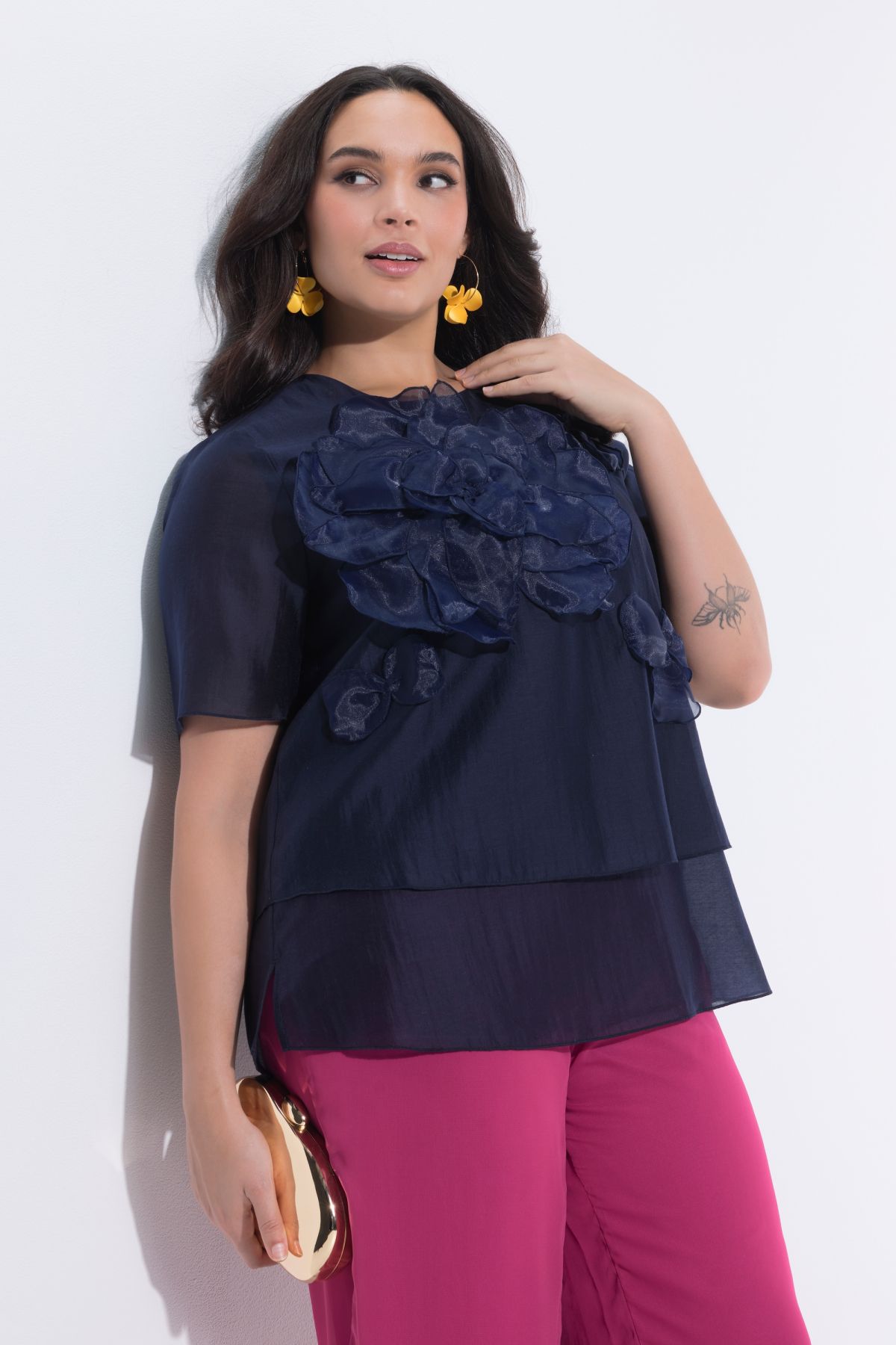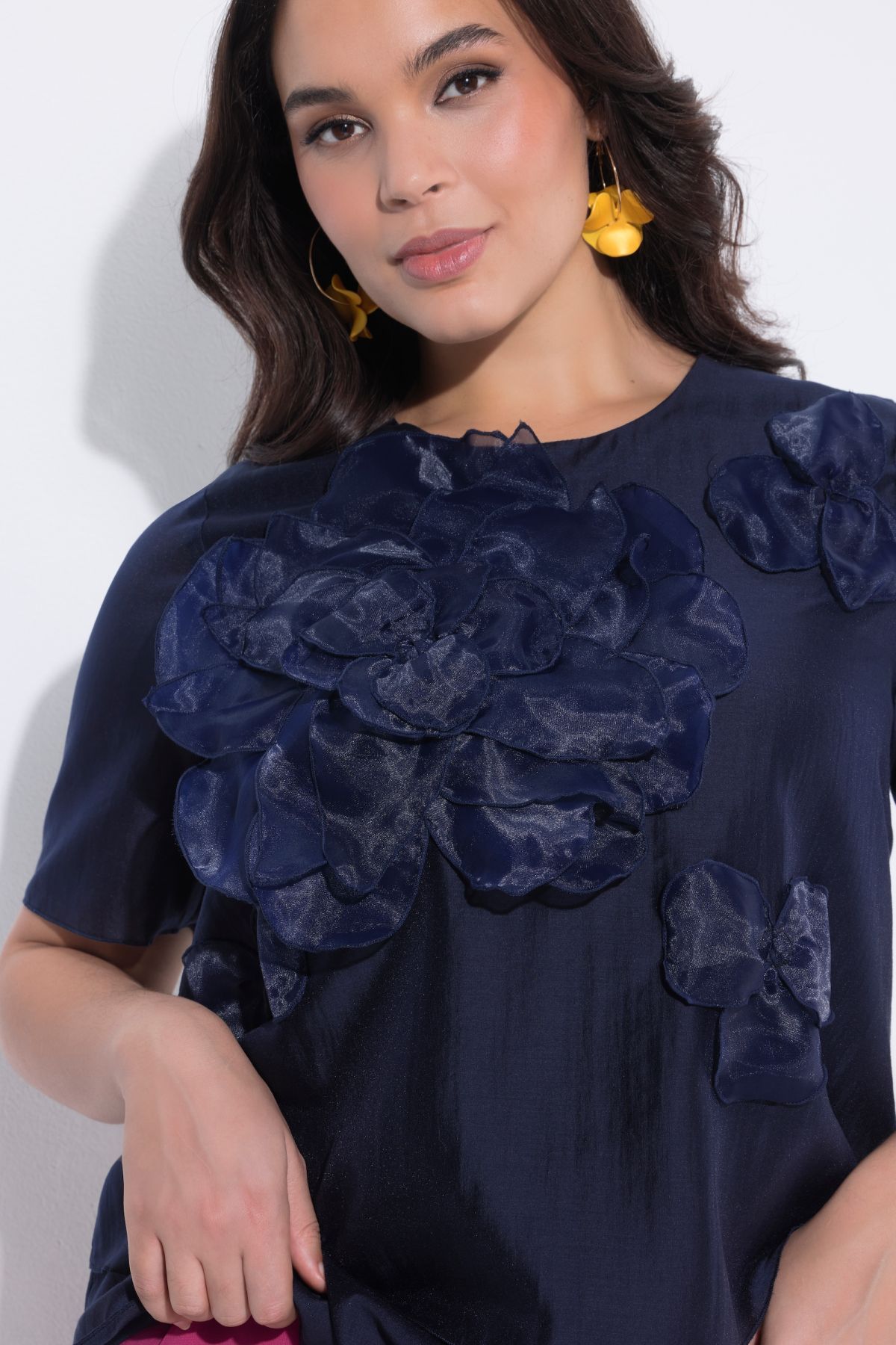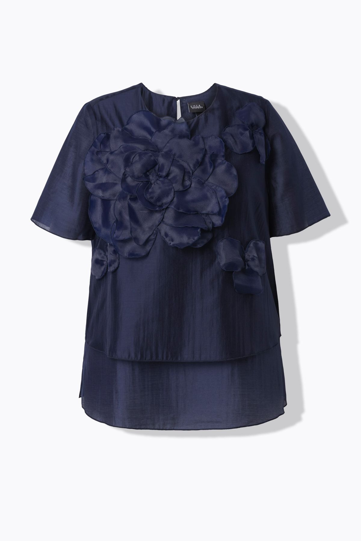 Floral Chiffon Applique Blouse Dimensional chiffon flowers add shape to this airy layered look.