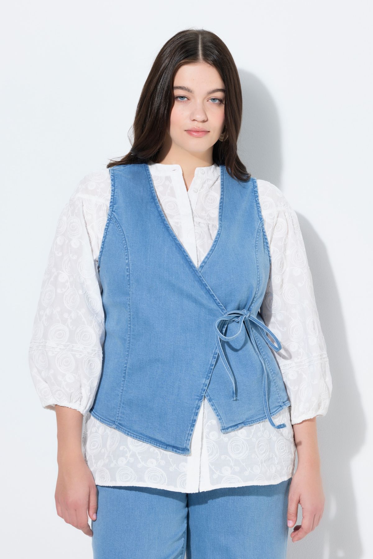 Eco Cotton Denim Wrap Vest An edgy asymmetric wrap-look silhouette to complete your favorite fit.
