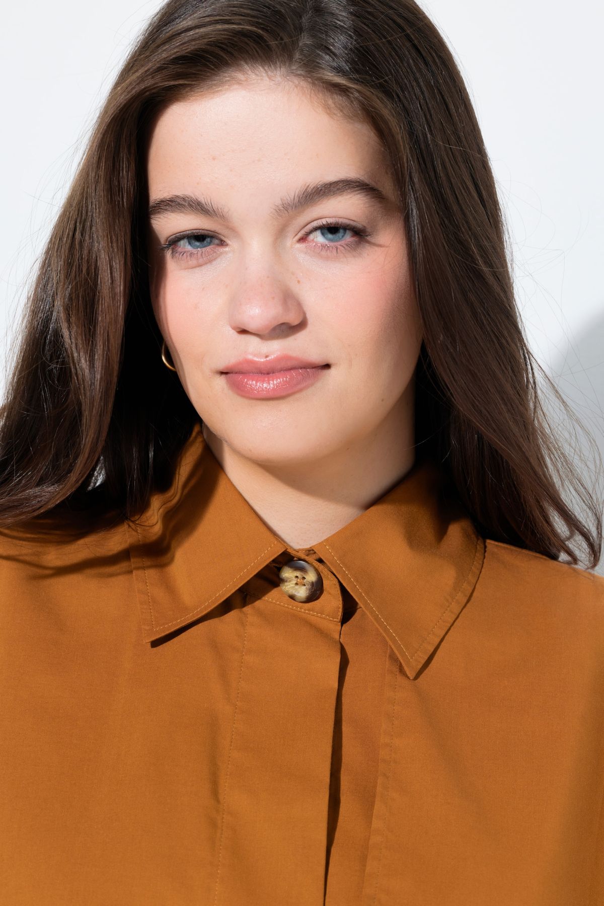 Къс, широк тренчкот с яка тип риза и раменна яка, скрито закопчаване с копчета, широки спуснати рамене с ръкави тип „прилеп“, изработен от органичен памук и рециклиран полиестер, дължина приблизително 50-54 см (с възможност за корекция на размера).