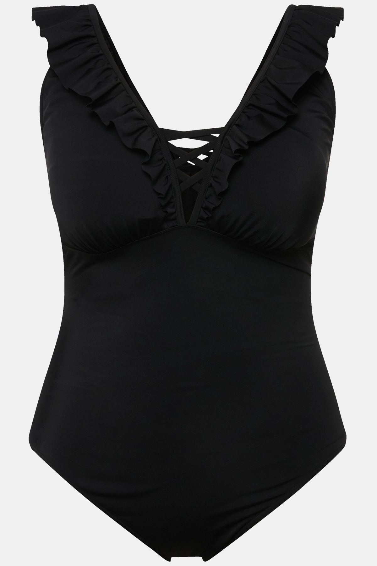 Swimsuit with removable soft cups. Ruffle and decorative ribbons on the V-neck. Front lining. Studio Untold is Ulla Popken's young fashion label. The focus is on a strong design statement, on the latest cuts, experimental materials and the most exciting new influences from the clubs and streets of the hottest fashion capitals around the world. The label for confident women who like to make statements.