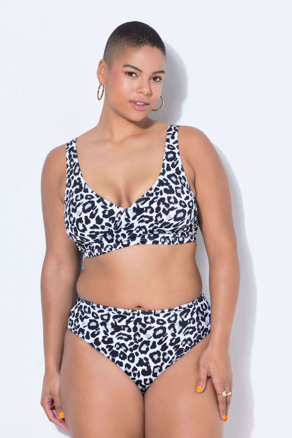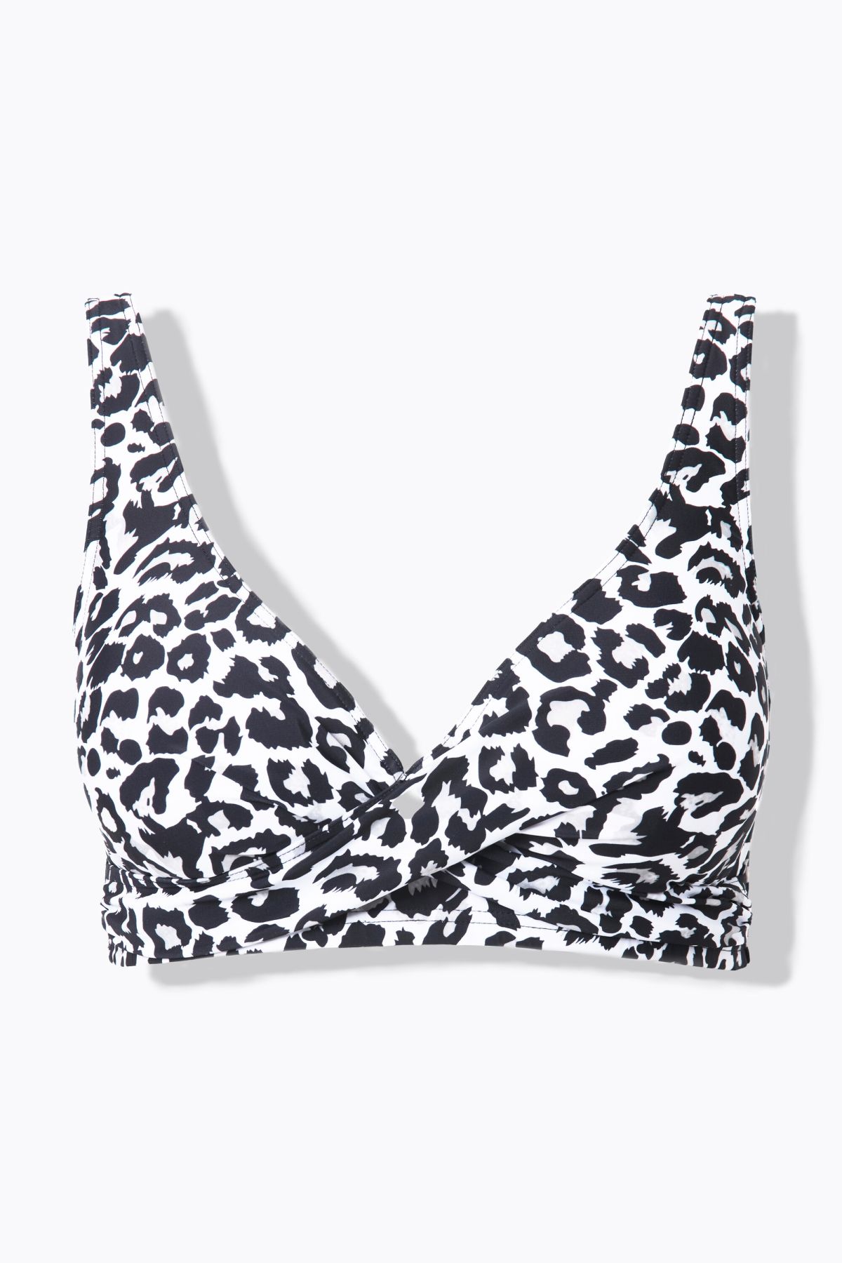 Bikini top with removable soft cups, leopard print and draped bust. V-neck, underbust band, front lining.
