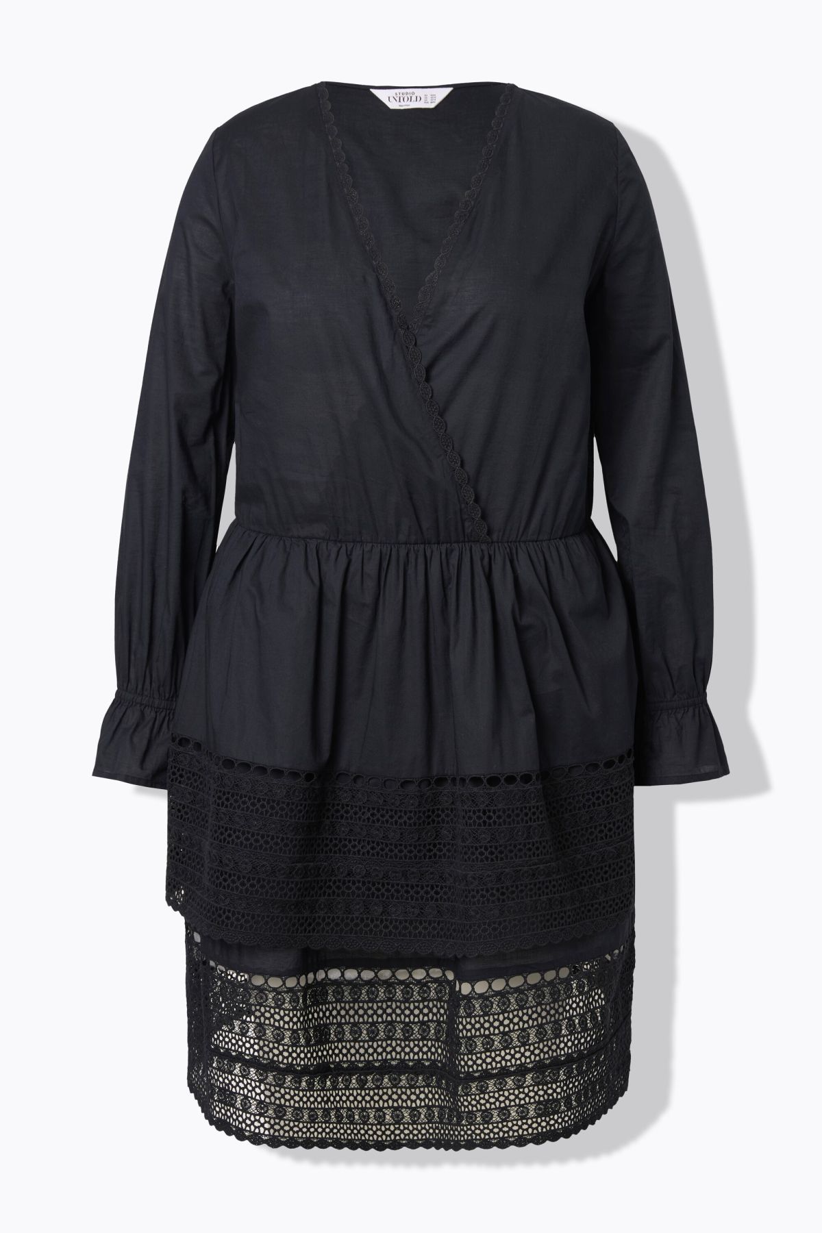 Dress with elasticated waist, double-layered skirt with lace ruffles at the hem. V-neck with lace and wrap effect. Long sleeves with elasticated ruffle.