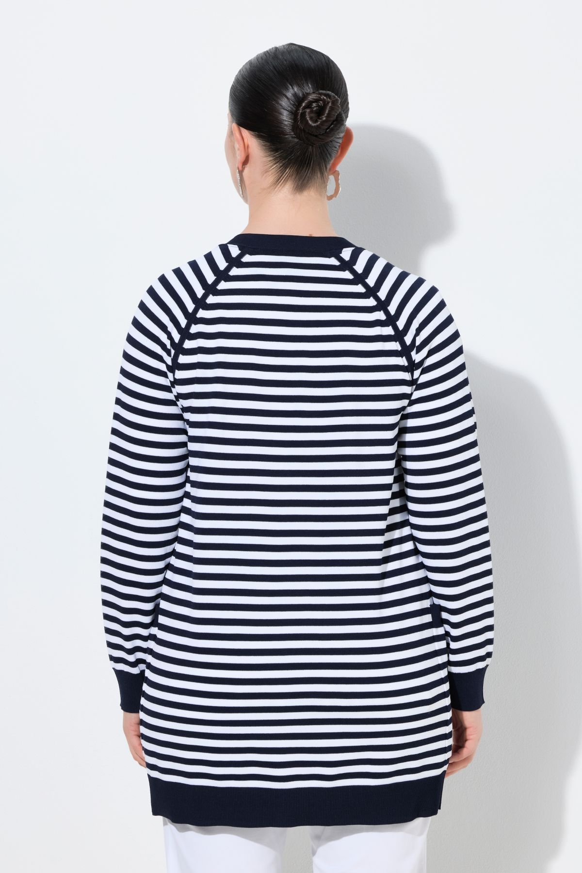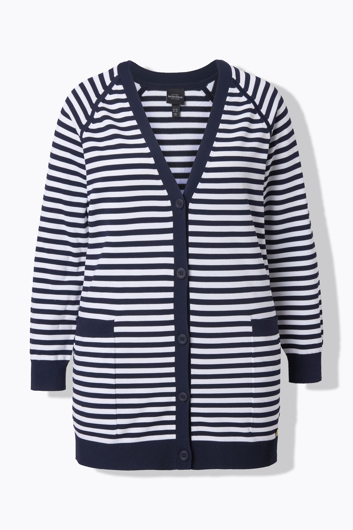 Cardigan, classic fit, made from soft, striped summer viscose fine knit, with a smooth drape. V-neck, button placket, patch pockets. Raglan long sleeves, ribbed cuffs.