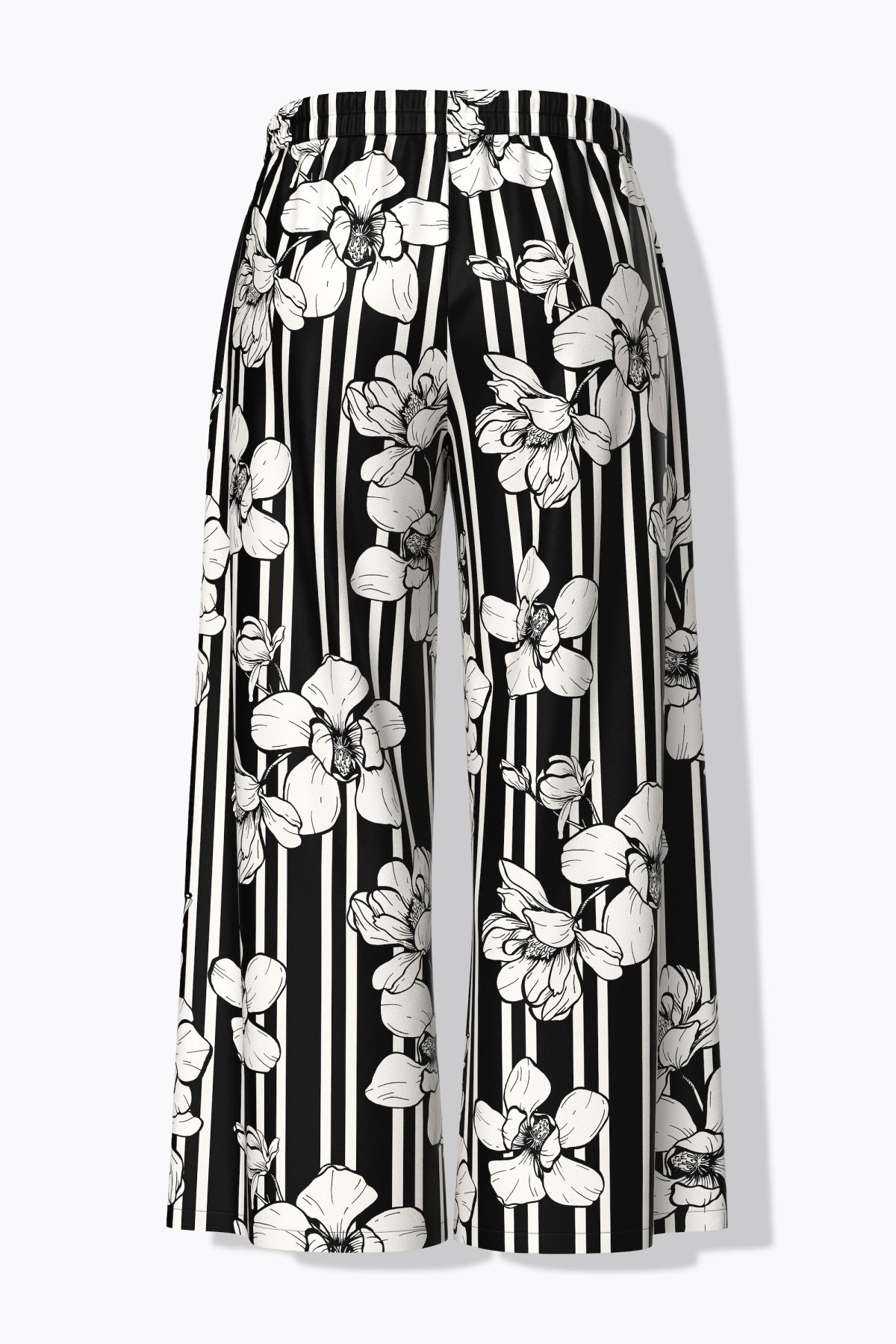 Palazzo trousers, wide, straight leg, made of soft, flowing viscose with a black and white floral stripe pattern. Elasticated waistband with side pockets.