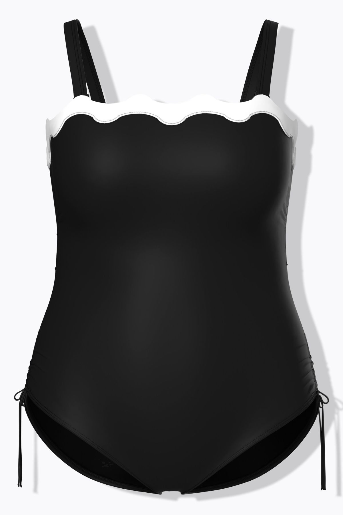 Multi-layer swimsuit with soft cups and removable, adjustable straps. Neckline with decorative piping, rubberized interior for a secure fit. Decorative side bands. Supportive underbust band, front lining. Made with recycled polyamide. OEKO-TEX certified.