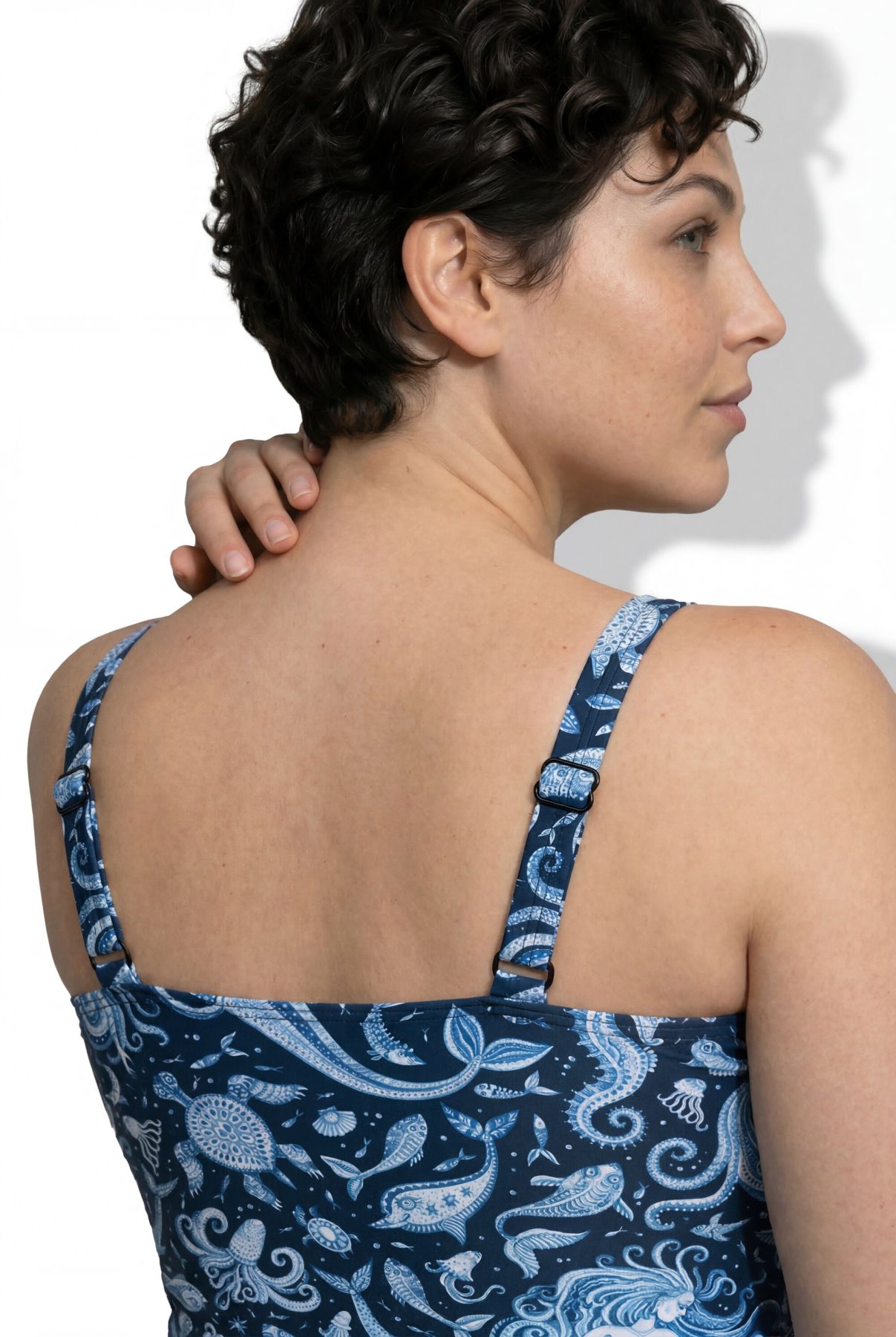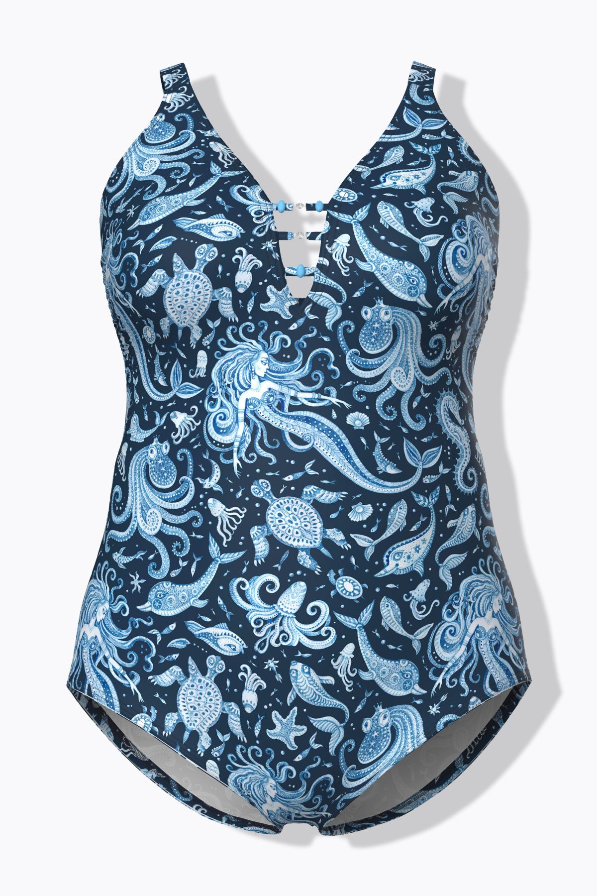 Swimsuit with soft cups and underwater print. Decorative bands with beads between the cups. Supportive underbust band, front lining. Made with recycled polyamide. OEKO-TEX certified.