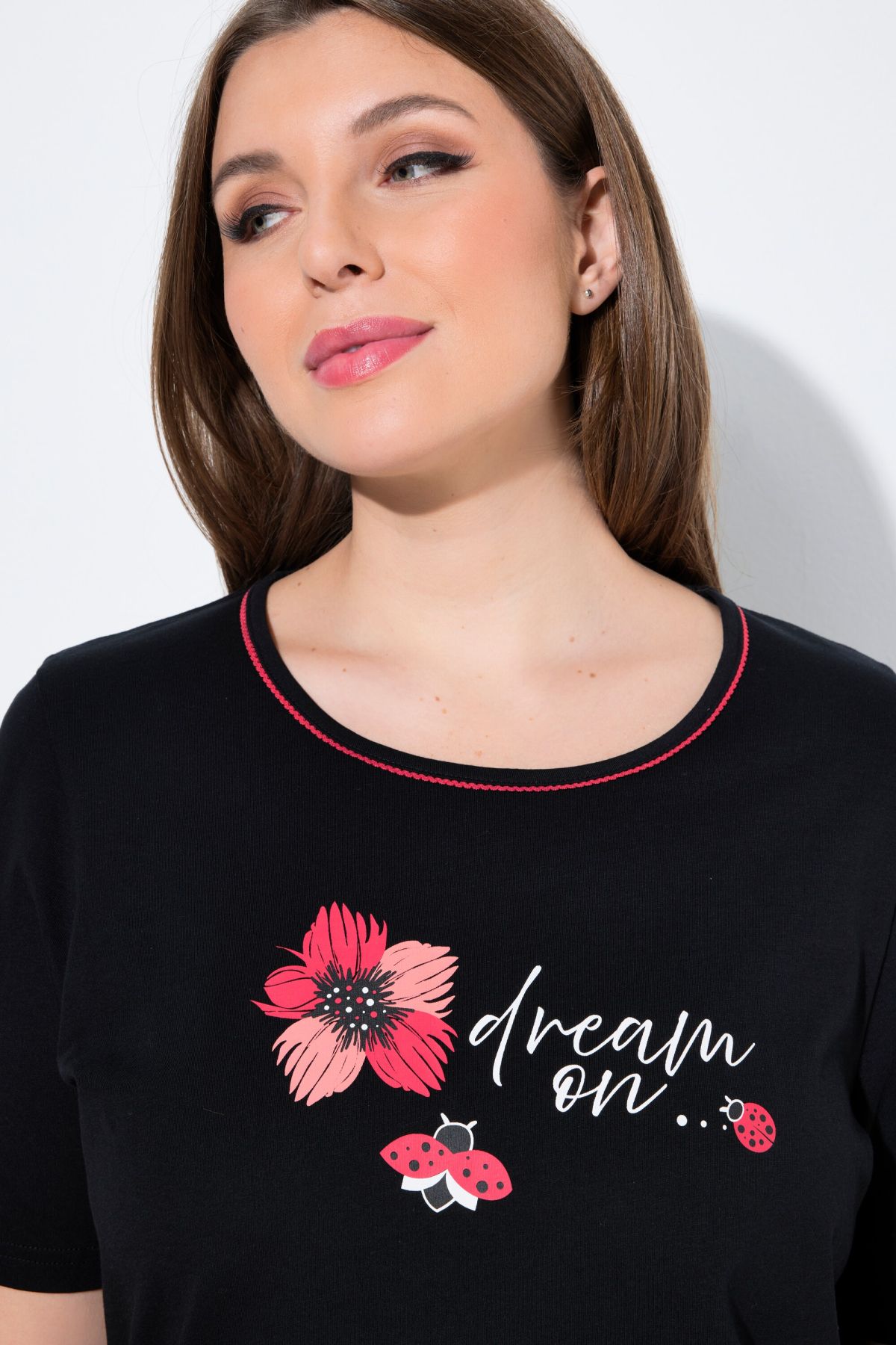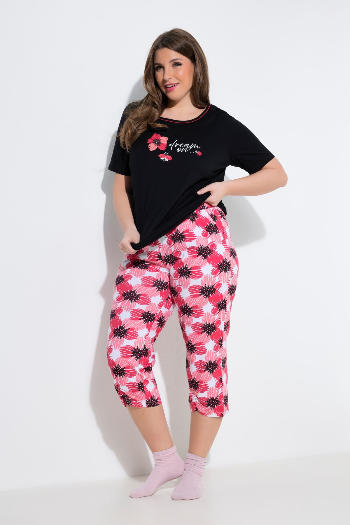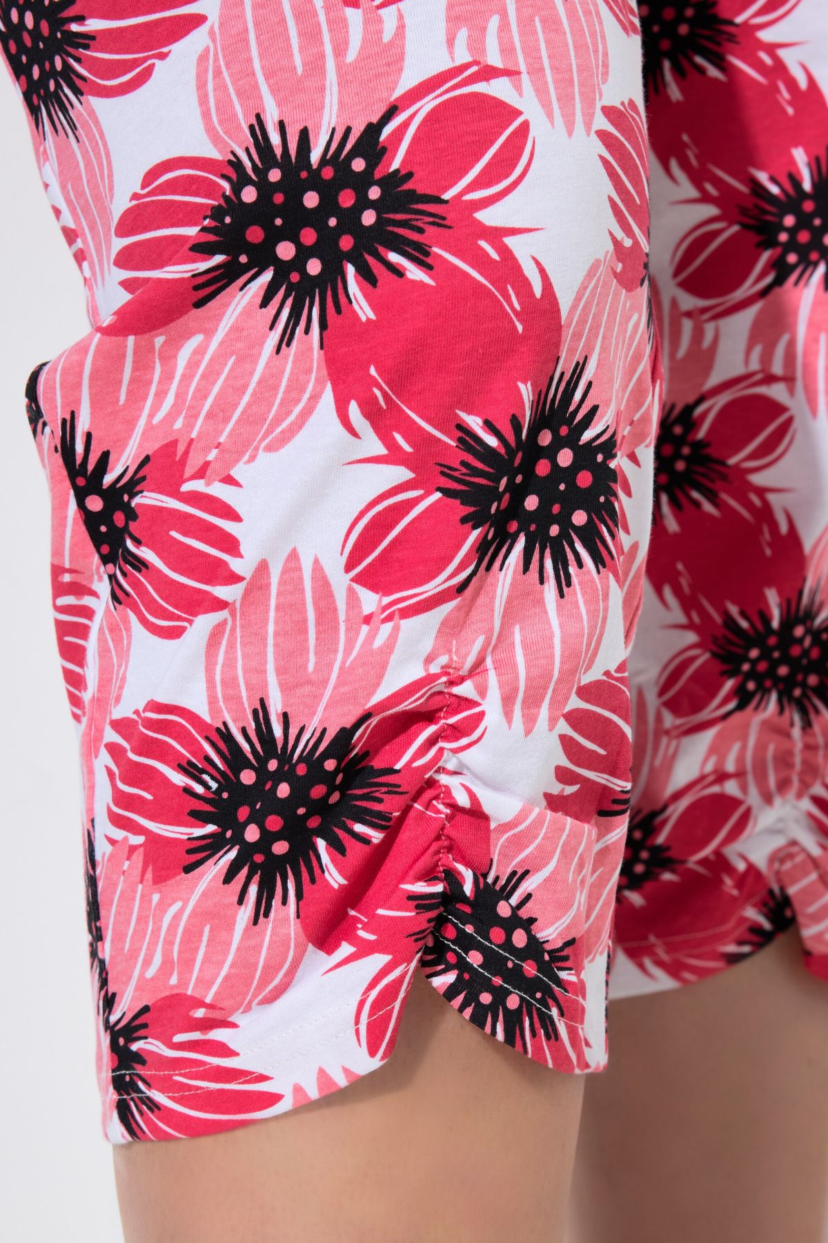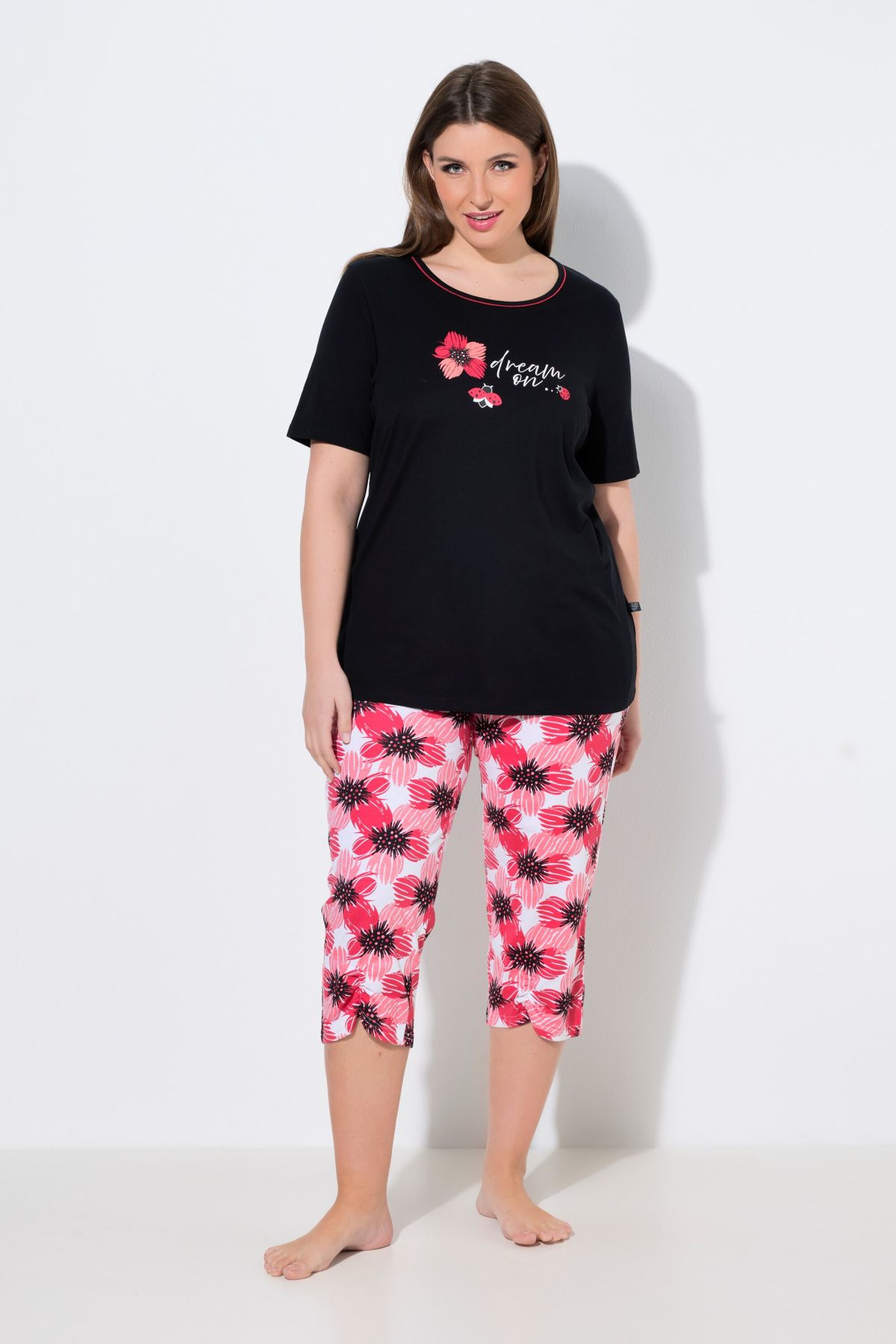 Two-piece pajama set. Plain floral-print shirt with round neck and short sleeves. Straight, comfortable floral-patterned pants with elastic waistband and side pockets.