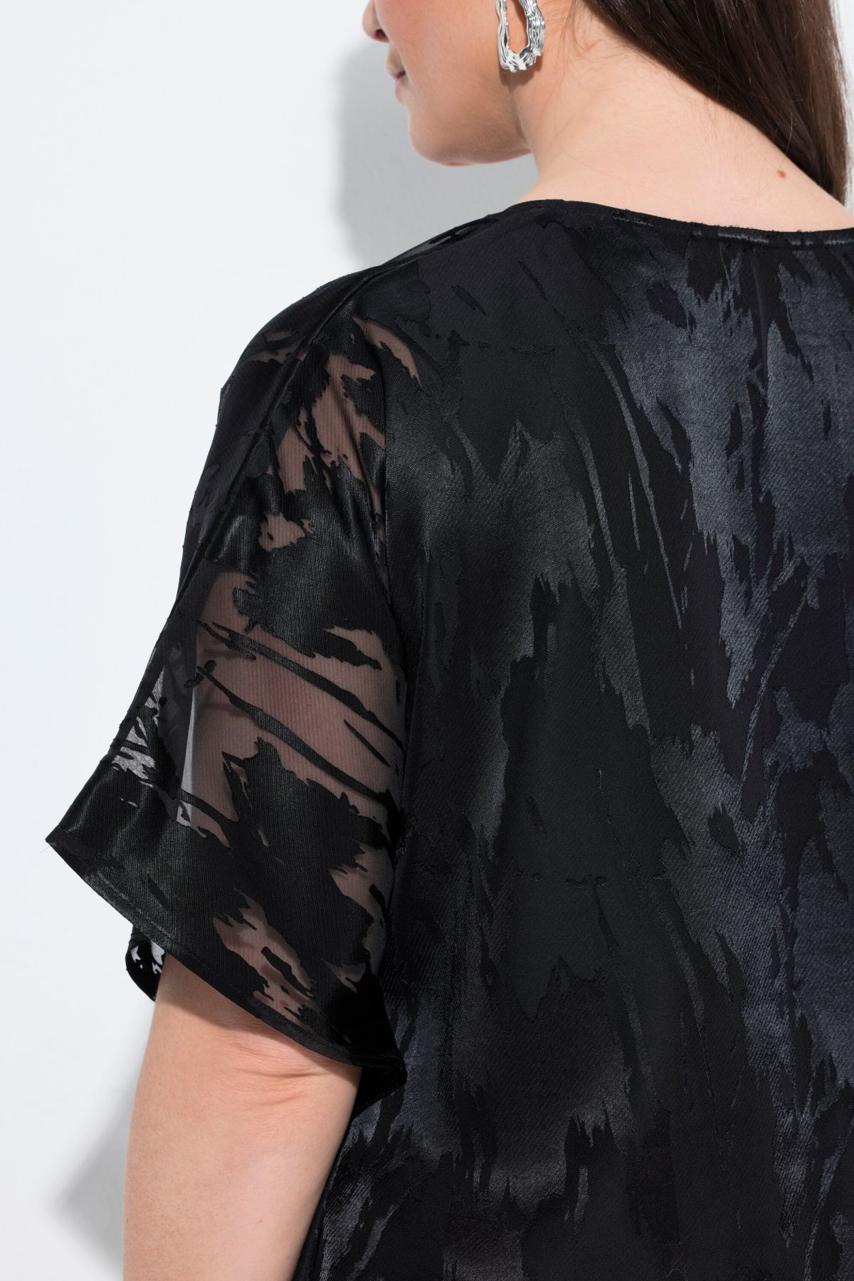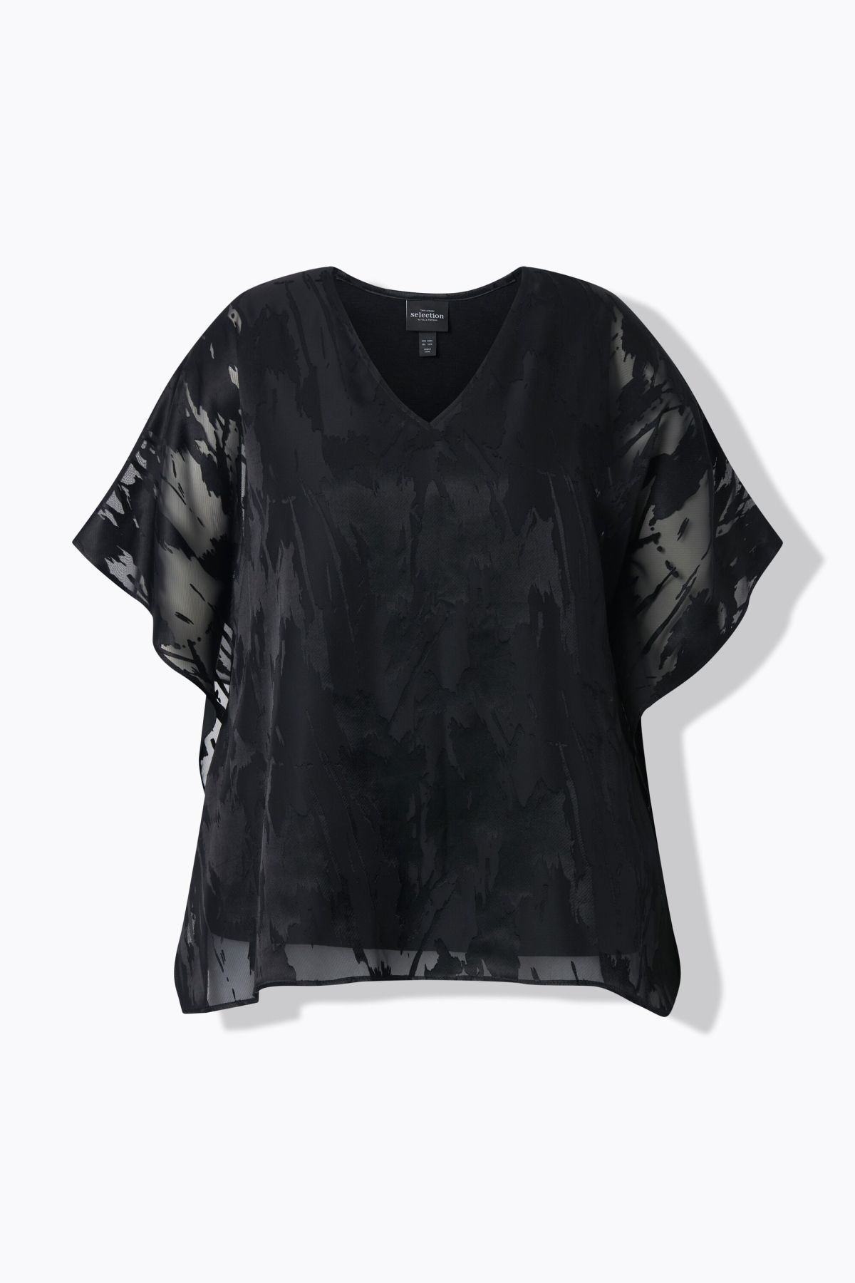 Chiffon blouse, oversized and double-layered. Top layer in sheer chiffon with an abstract design. V-neck, wide dropped shoulders. Opaque jersey top underneath. Premium fashion for you! Selection by Ulla Popken stands for quality and wearable elegance. Selection by Ulla Popken transforms classics into modern highlights made from high-quality materials with elaborate prints and details – perfect for everyday wear and special occasions!