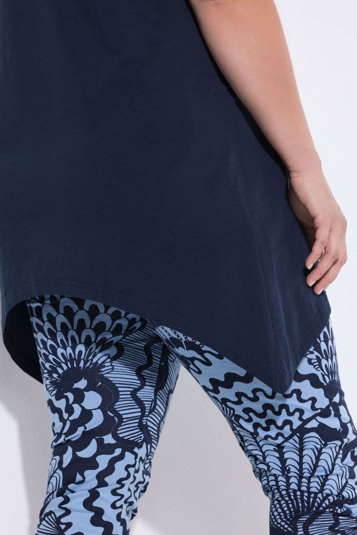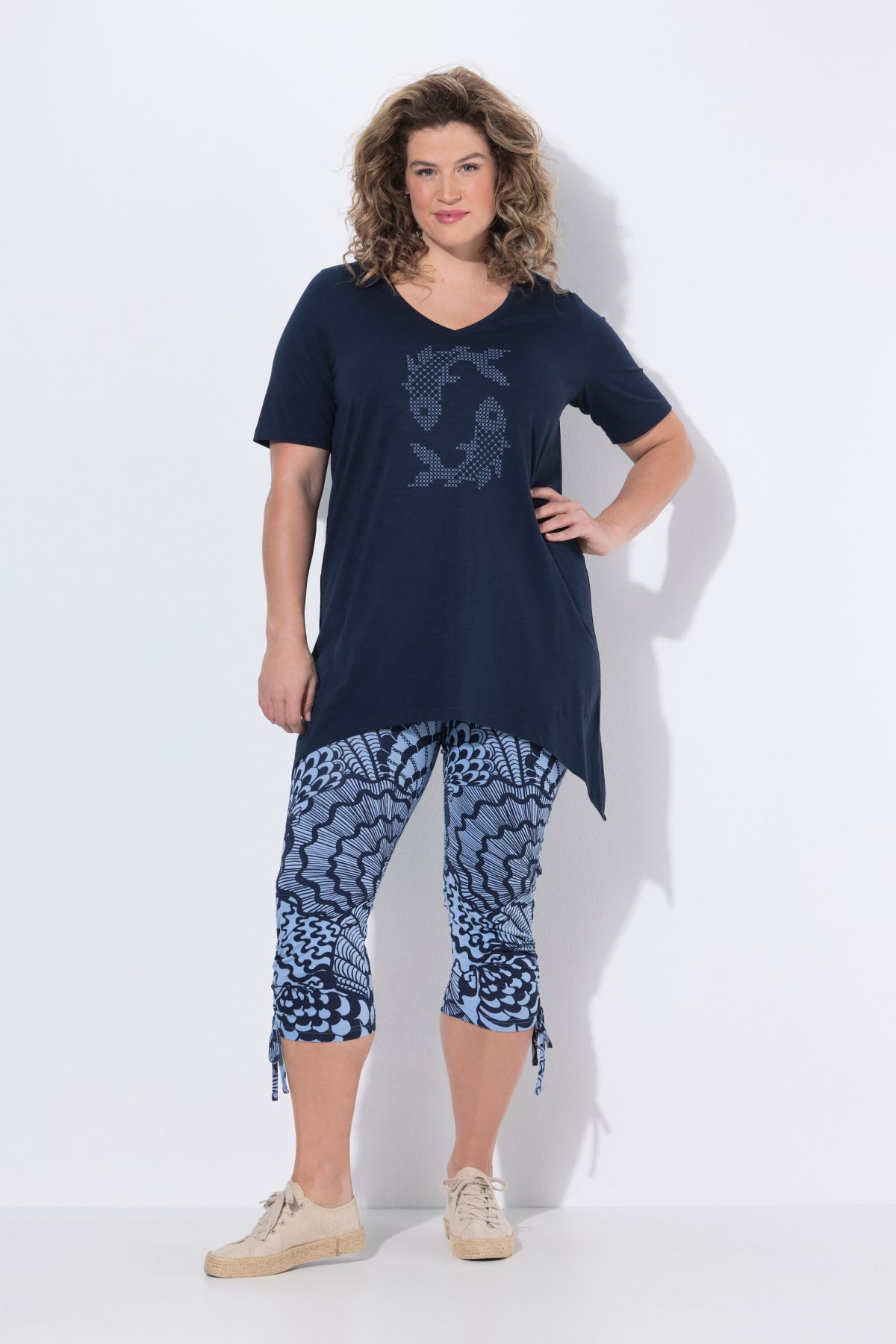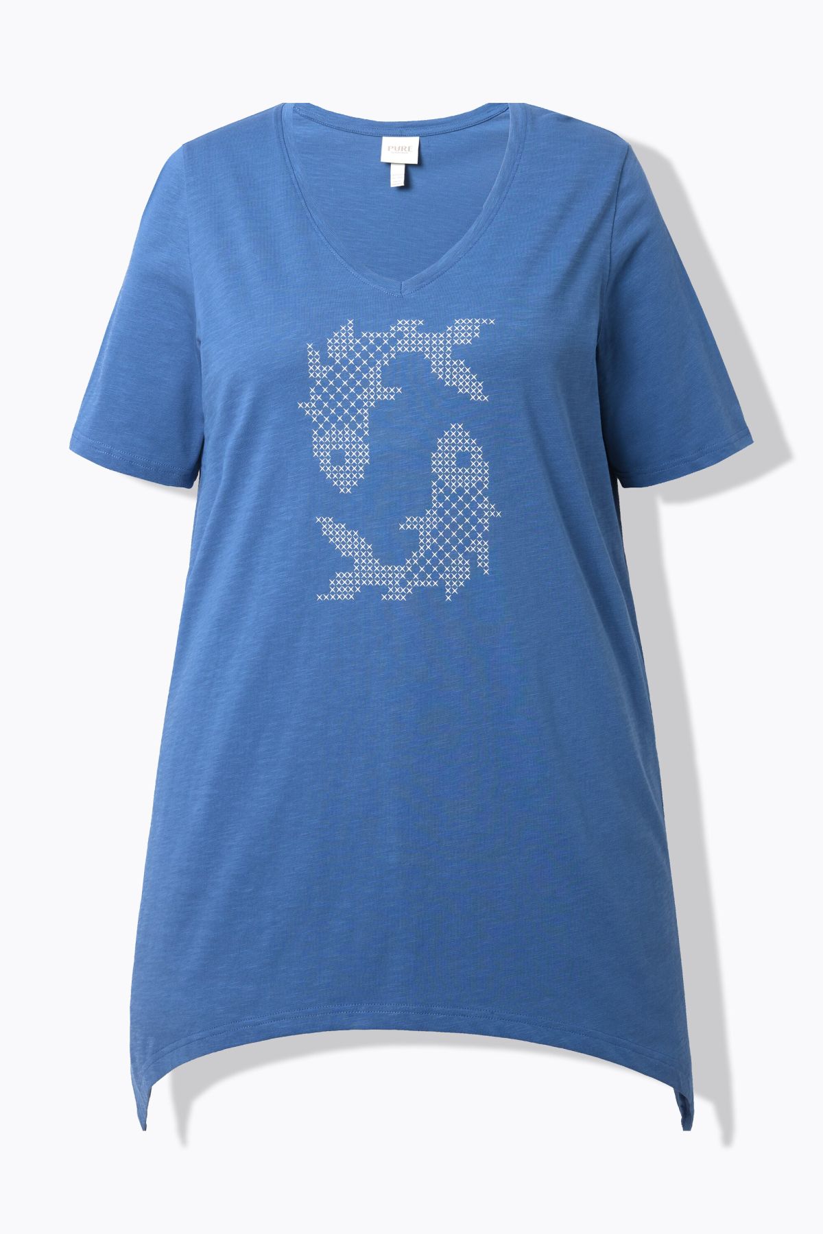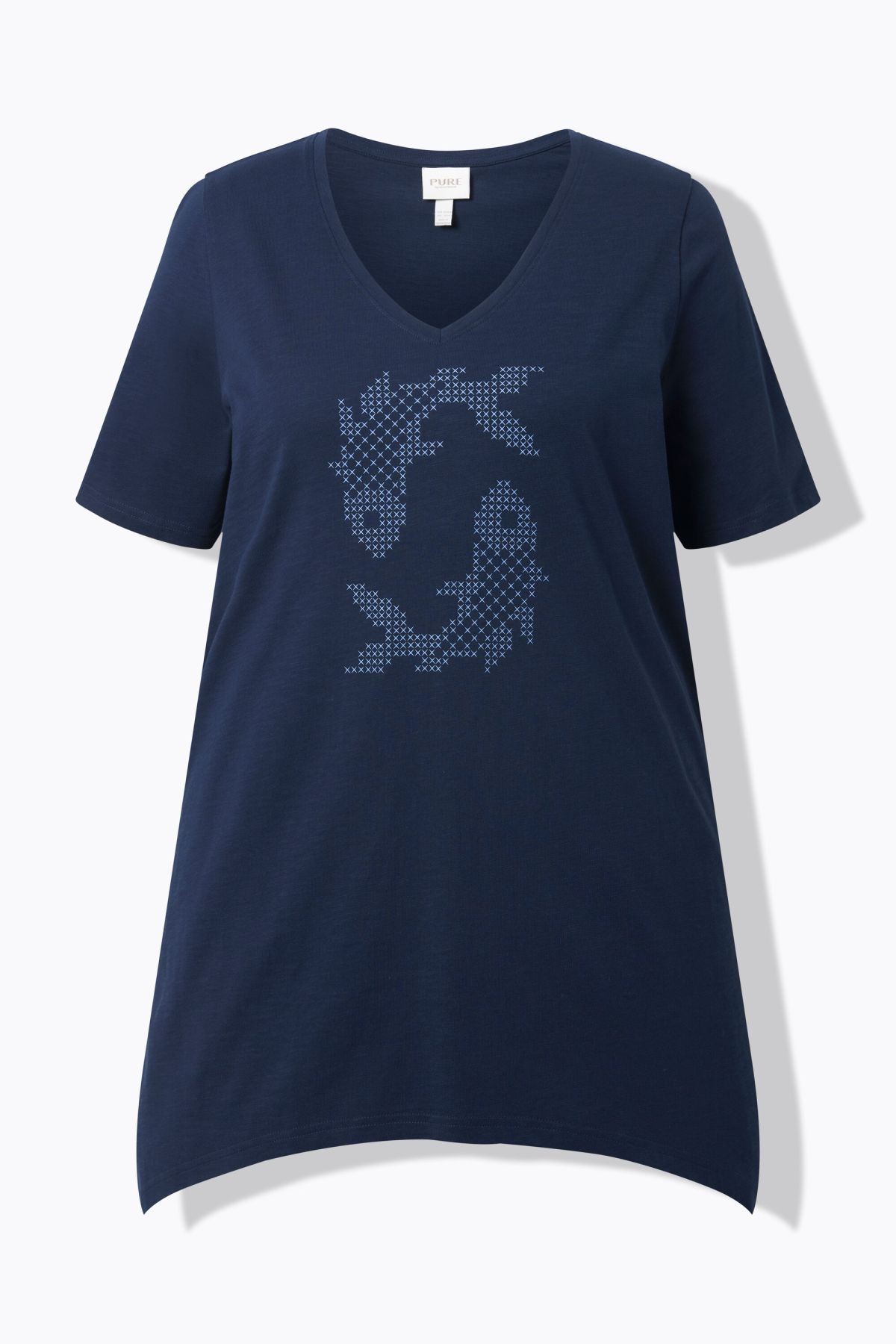 Organic cotton T-shirt. Comfortable A-line cut with fish motif, round neck. Short sleeves, pointed hem. Organic; certified by ECOCERT Greenlife Licence no. 152026.