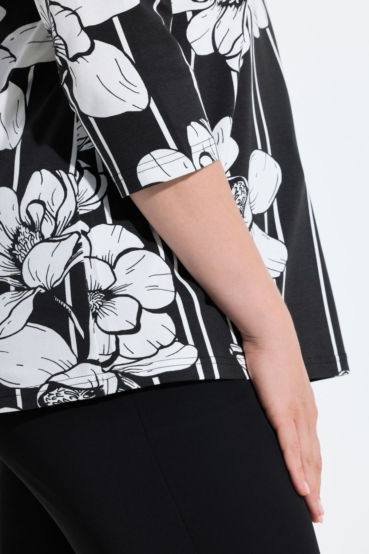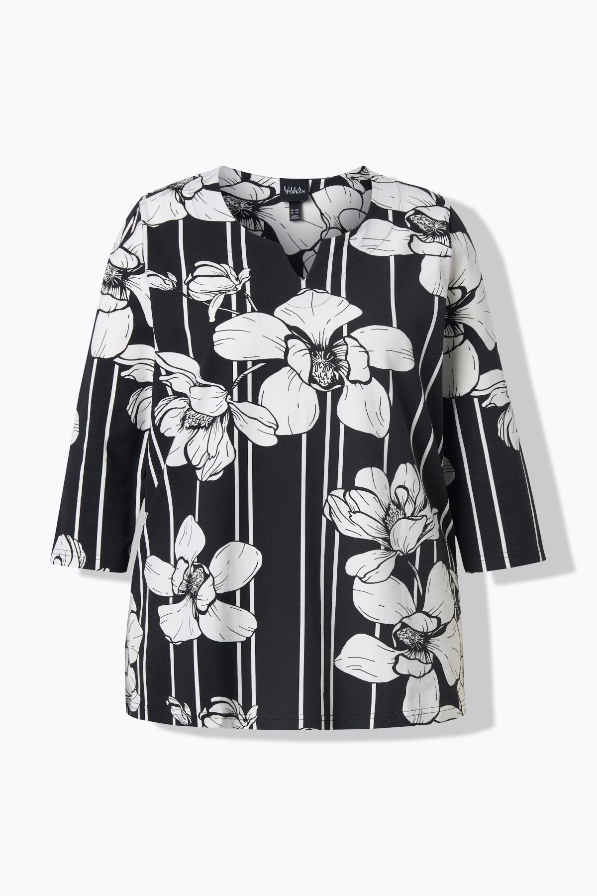 A-line shirt with a comfortable hem width, made from pleasantly stretchy jersey with a floral/striped pattern. V-neck, 3/4 sleeves.