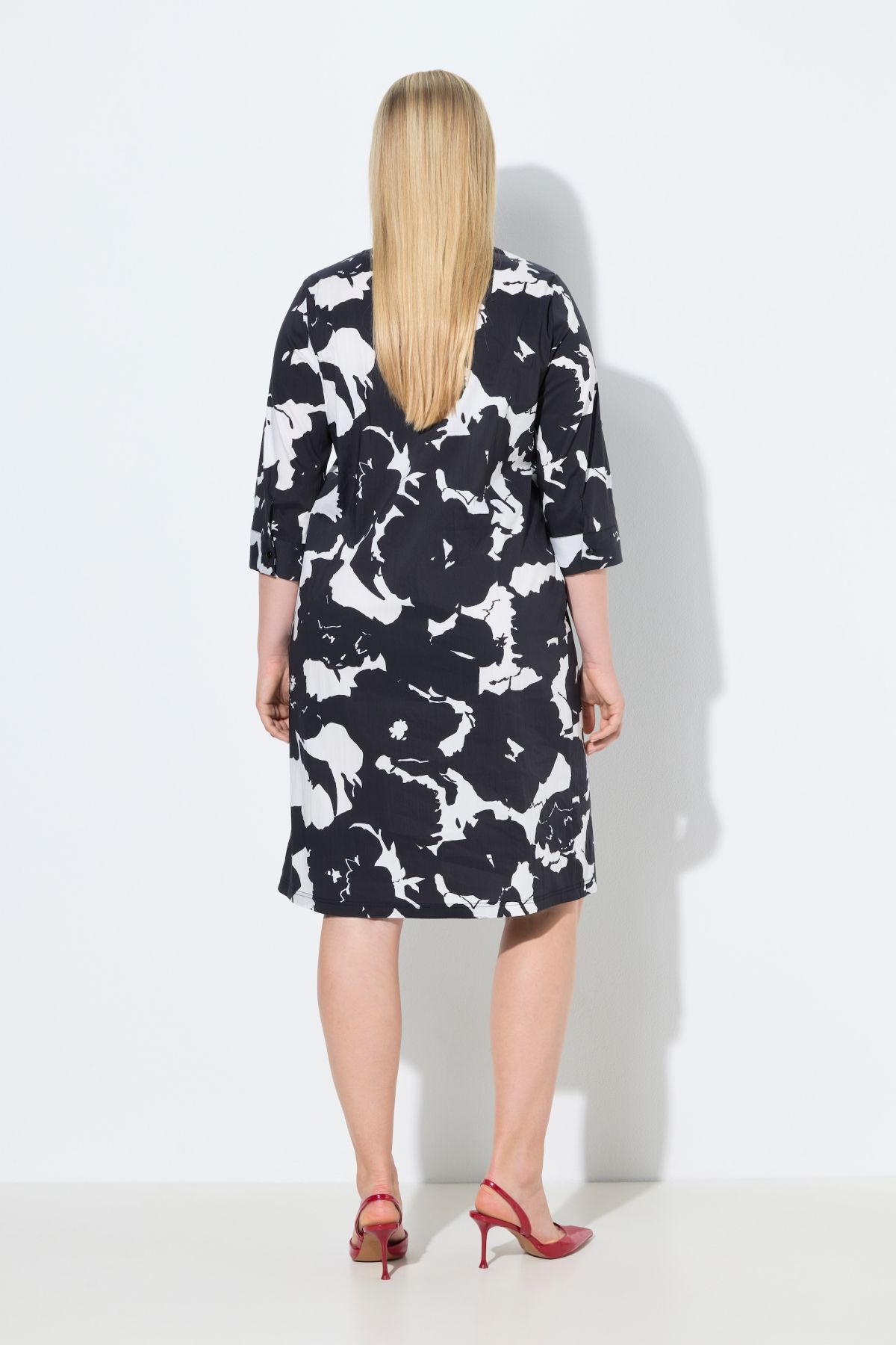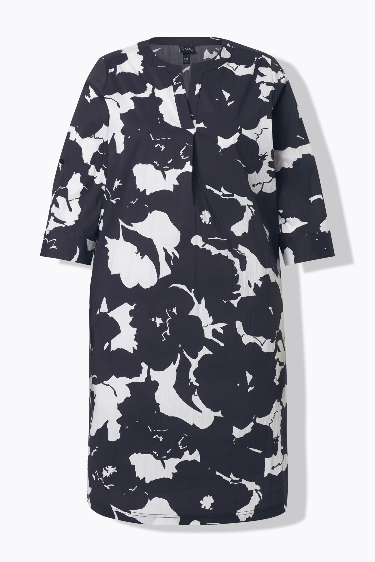 Tunic dress, short, straight fit, in a comfortably stretchy woven fabric with an abstract floral pattern. Decorative pleat below the neckline. Three-quarter sleeves with turn-up tabs for half-sleeves; striped cuffs on the inside. Side seam pockets.