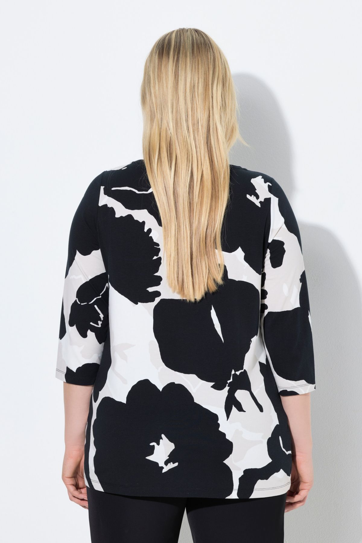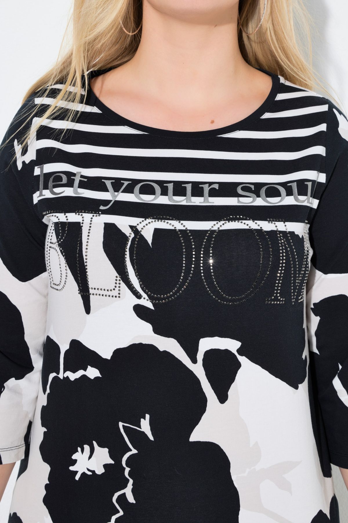 T-shirt, classic fit, made from comfortably stretchy jersey with a floral pattern and rhinestone lettering. Striped shoulders, boat neck, 3/4 sleeves.