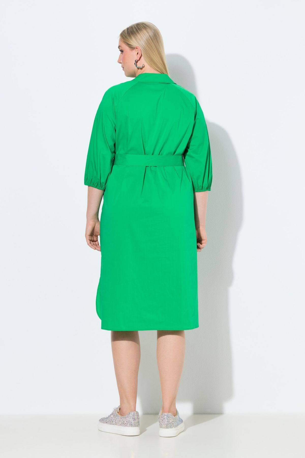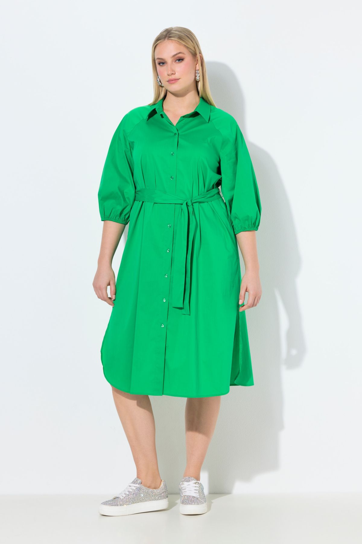 Shirt dress, A-line in a versatile midi length, with wide 3/4 raglan balloon sleeves. Elasticated cuffs. Shirt collar, full button placket, tie belt at the waist – always your desired silhouette. Side seam pockets, rounded hem with long side slits – even more comfort.